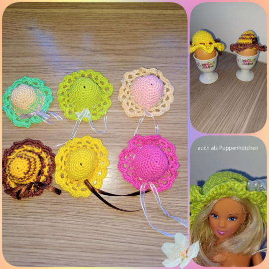 Die kleinen Hütchen passen auf handelsübliche Eiergrößen, aber auch als Sonnenhüte für kleinere PUppen / ankleidepuppen kannst du sie häkeln.