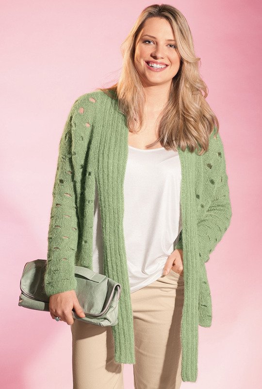 Die Jacke in Lindgrün hat gleich mehrere Besonderheiten: Das Garn hat einen leichten Glitter, auffälligen Schlitze und einen Schalkragen, der entweder lässig an beiden Seiten herunterhängen kann oder vorne geknotet wird. Gestrickt wird glatt rechts, wobei in gleichmäßigen Abständen Schlitze durch Abketten und Neuanschlagen der Maschen entstehen. Der Schalkragen wird als breiter Streifen im 3/2-Rippenmuster gestrickt, dann in den Halsausschnitt und an die Vorderteilschrägen genäht. Eine Anleitung steht für Größe 42/44 und 52/54 zur Verfügung.
