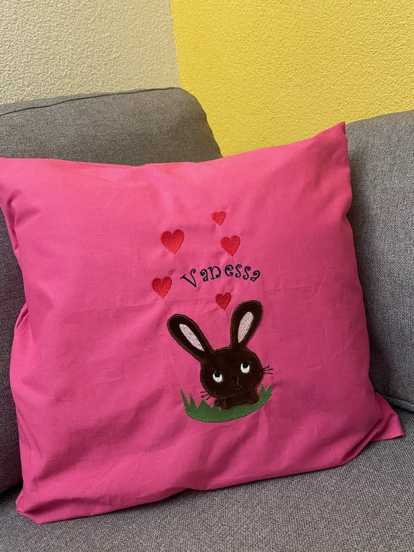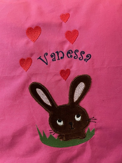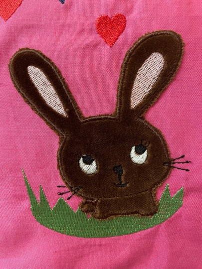 Mit diesem Kauf erhälst du die Stick-/ Applikationsdatei für den Hasen sowie die Wiese und die Herzen als Verzierung.
