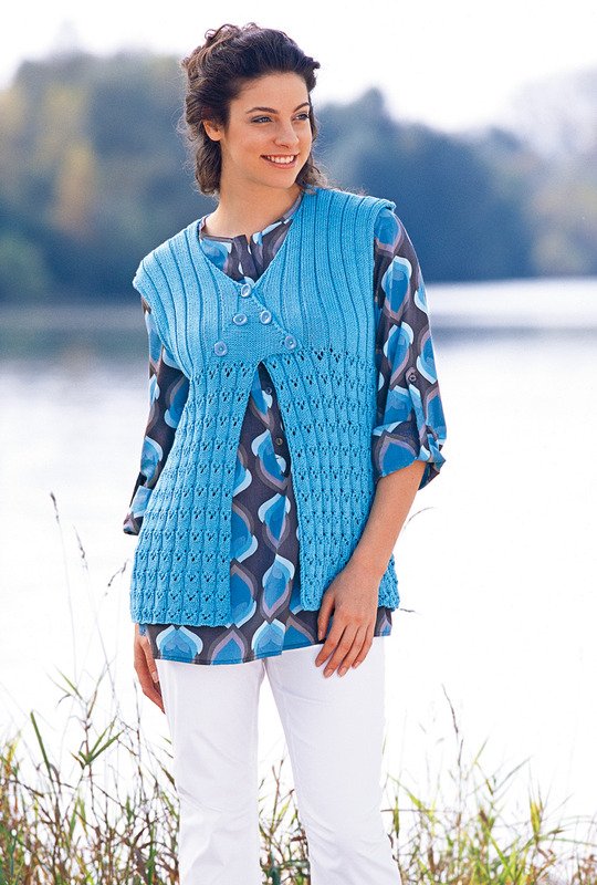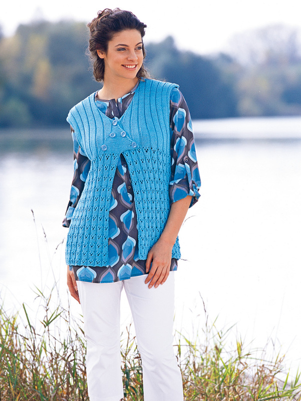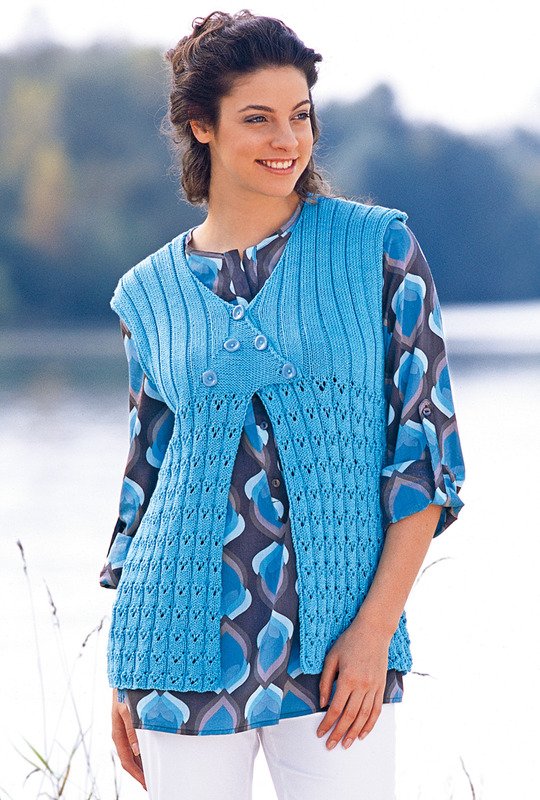 Westen sind das ergänzende Accessoire für Blusen und T-Shirts, vor allem, wenn sie allein etwas zu kühl sind. Mit dem interessanten Dreiecksverschluss mit 5 Knöpfen im Brustbereich springt die Weste locker nach unten hin auf. Unterschiedliche Muster – am Unterteil ein einfaches Ajourmuster, an der Passe ein breites Rippenmuster sorgen für abwechslungsreiches Stricken. Das türkisfarbene Baumwoll-Viskose-Mischgarn läuft beim Stricken angenehm von der Nadel und ist einfach zu pflegen. Die Anleitung gibts zum Downloaden für die Größen 42/44 und 46/48 sowie 50/52.