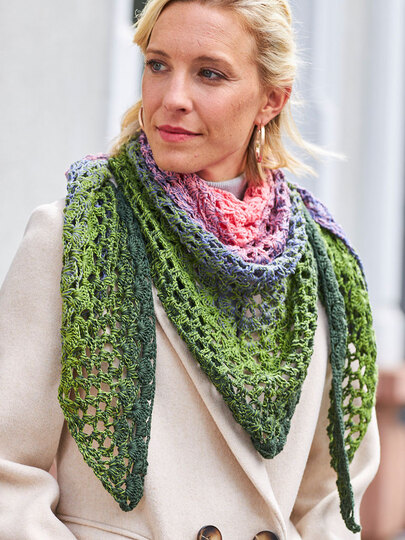 Dieses Tuch beginnt unten an der Halsmitte und wird durch Zunahmen inder Mitte und rechts und links immer breiter.