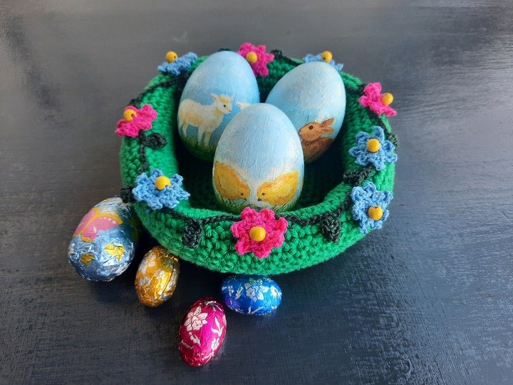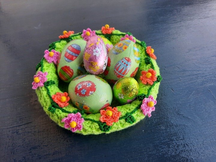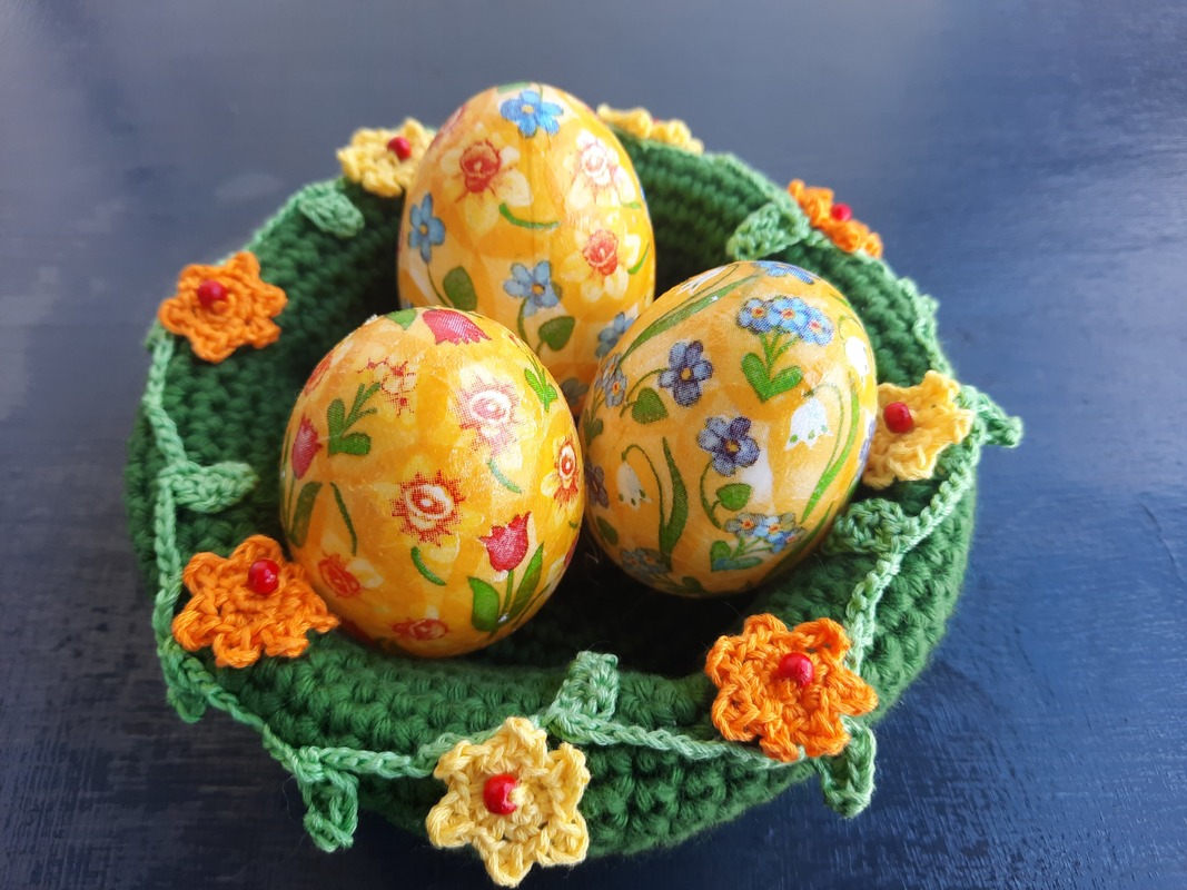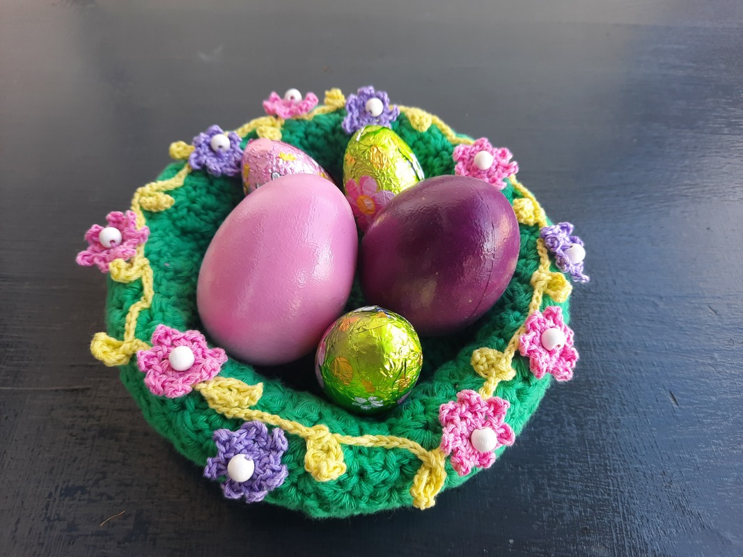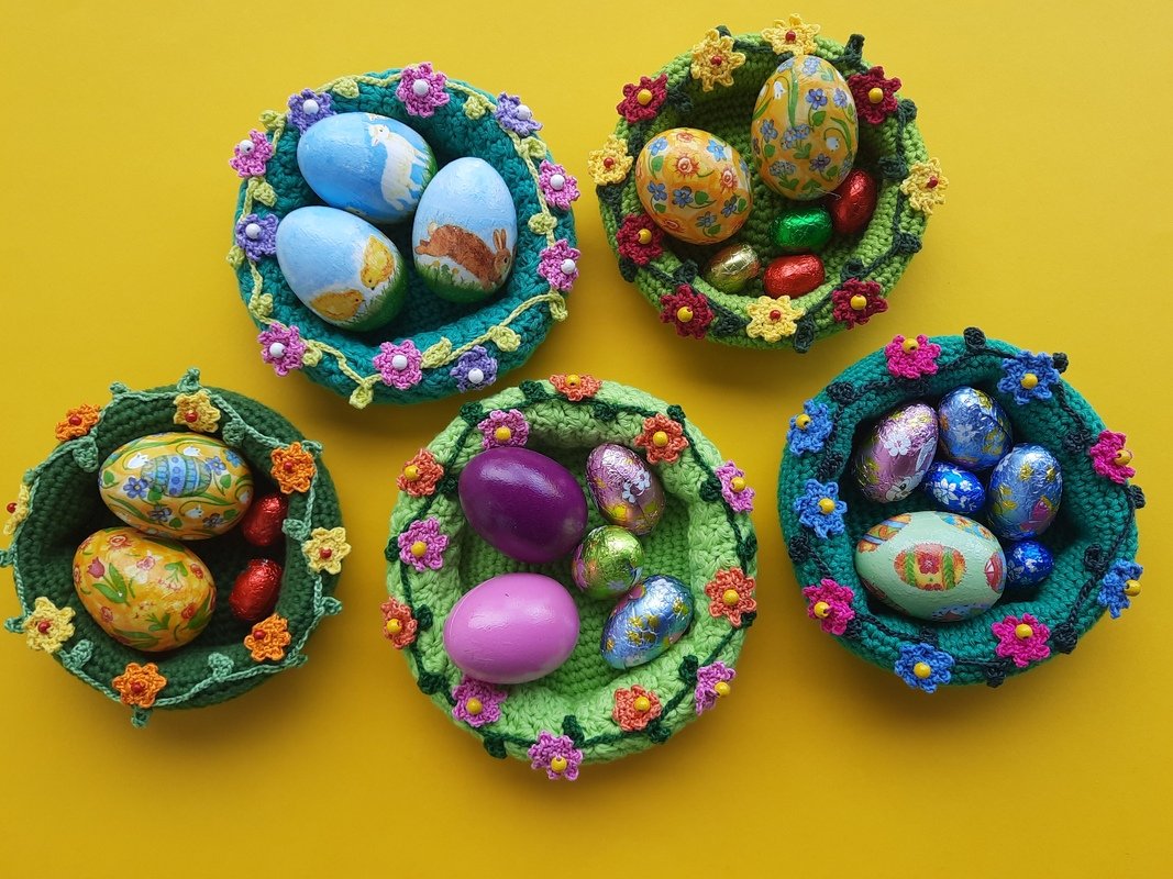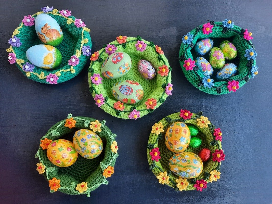 Für fröhliche Osterfarben sorgen diese blumigen Nestchen, die auch außerhalb von Ostern für Schmuck, Haarspangen, Bonbons, den Schlüsselbund und ähnliches mehr nützlich sind. Du kannst sie in allen möglichen Grüntönen und mit Blüten in passenden Farben häkeln. Viel Spaß beim österlichen Dekorieren!