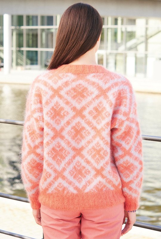 Dieser in Intarsientechnik gestrickte Pulli leuchtet in einem herrlichen Korallenrot und zurückhaltendem Hellgrau. Dazu ein edles Garn aus fluffigem Mohair-Seide-Gemisch, das sich supersoft auf der Haut anfühlt. Wer gerne Jacquardmuster strickt, kommt hier voll seine Kosten. Da erübrigt sich ein komplizierter Schnitt, denn dieses Modell wirkt am besten ohne Armausschnittrundungen und Armkugel. Alle Bündchen und die breite Blende um den schmal anliegenden runden Halsausschnitt werden in 2/2-Rippen in Korallenrot gearbeitet. Die Anleitung dazu steht in den Größen 38/40, 42/44 und 46/48 zur Verfügung.