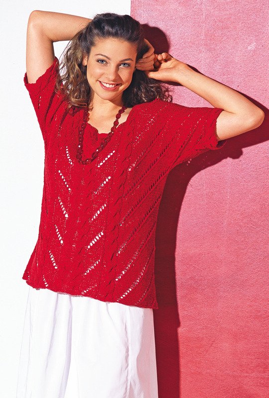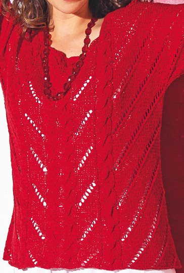 Diagonale Lochstreifen kennzeichnen diesen sommerlichen Pulli mit tollem Ausschnitt und kurzen Ärmeln. Zopfstreifen grenzen die löchrigen Diagonalen voneinander ab und umgeben auch den eckigen Halsausschnitt und bilden die Ärmelblenden. Das frische leuchtende Rot steht jeder Frau und passt sowohl zu einem weißen Rock als auch zur dunkelblauen Jeans. Der Schnitt ist einfach, die Ärmel werden an Vorder- und Rückenteil gleich mitgestrickt. Die Anleitung steht zum Download bereit für die Größen 42/44 und 46/48 sowie 50/52.