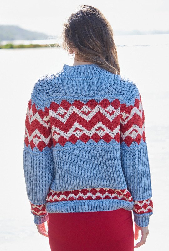 Der Pulli mit Turtleneck-Kragen aus weichem Schurwolle-Mischgarn lebt von seinem kraftvollen Kontrast – die hellblauen Flächen im Halbpatent wechseln sich mit den unten kleinzackigen und oben über die Brust großzackigen Jacquard-Musterstreifen in Rot und Natur ab. Das Rippenmuster der Bündchen und der Ausschnittblende werden 1 rechts verschränkt, 1 links gestrickt. Zwischen den Jacquardstreifen und dem Halbpatentmuster sind kraus rechts und kraus links gestrickte schmale Streifen, die die ganze Musterfolge sehr plastisch wirken lassen. Die Anleitung gibts zum Downloaden für die Größen 38/40, 42/44 und 46/48.