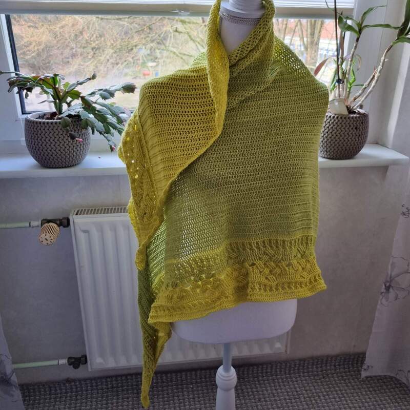 Für dieses Tuch braucht man Kenntnisse zu Luftmaschen, Stäbchen, Doppelstäbchen, vordere und hintere Reliefstäbchen. Bereits vorhandene Kenntnisse über Zopfmuster sind von Vorteil.