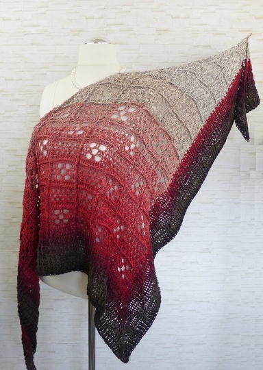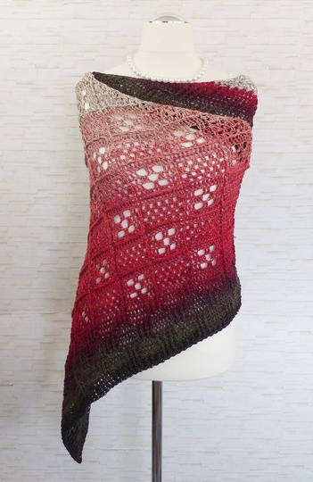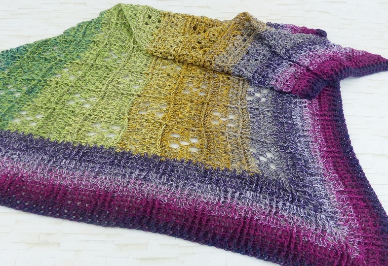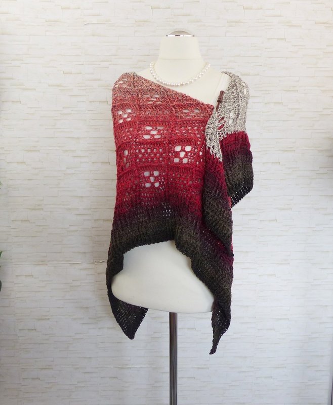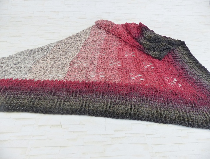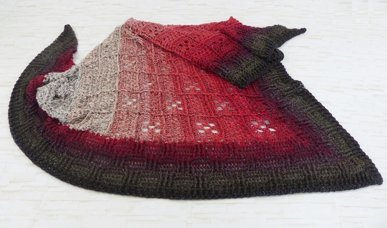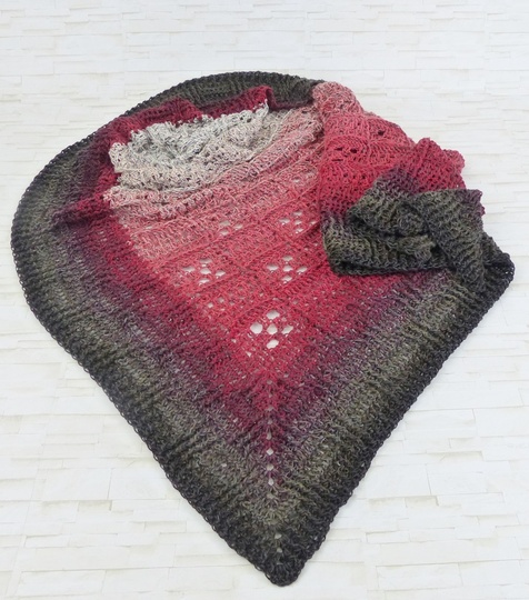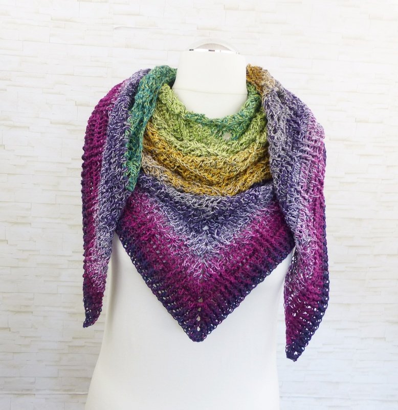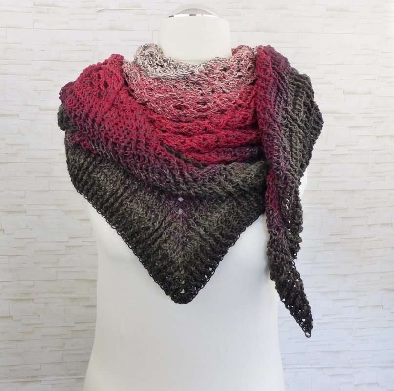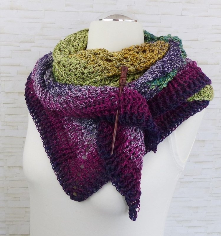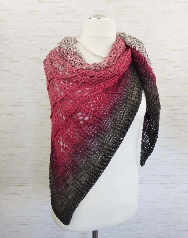 Das Tuch ist ein Wendetuch. Das Muster ist beidseitig gleich. Somit braucht man beim Tragen nicht darauf achten, welche Seite die "Schöne" ist. Mit jedem Farbverlaufsgarn bestimmt ein außergewöhnlicher Blickfang.