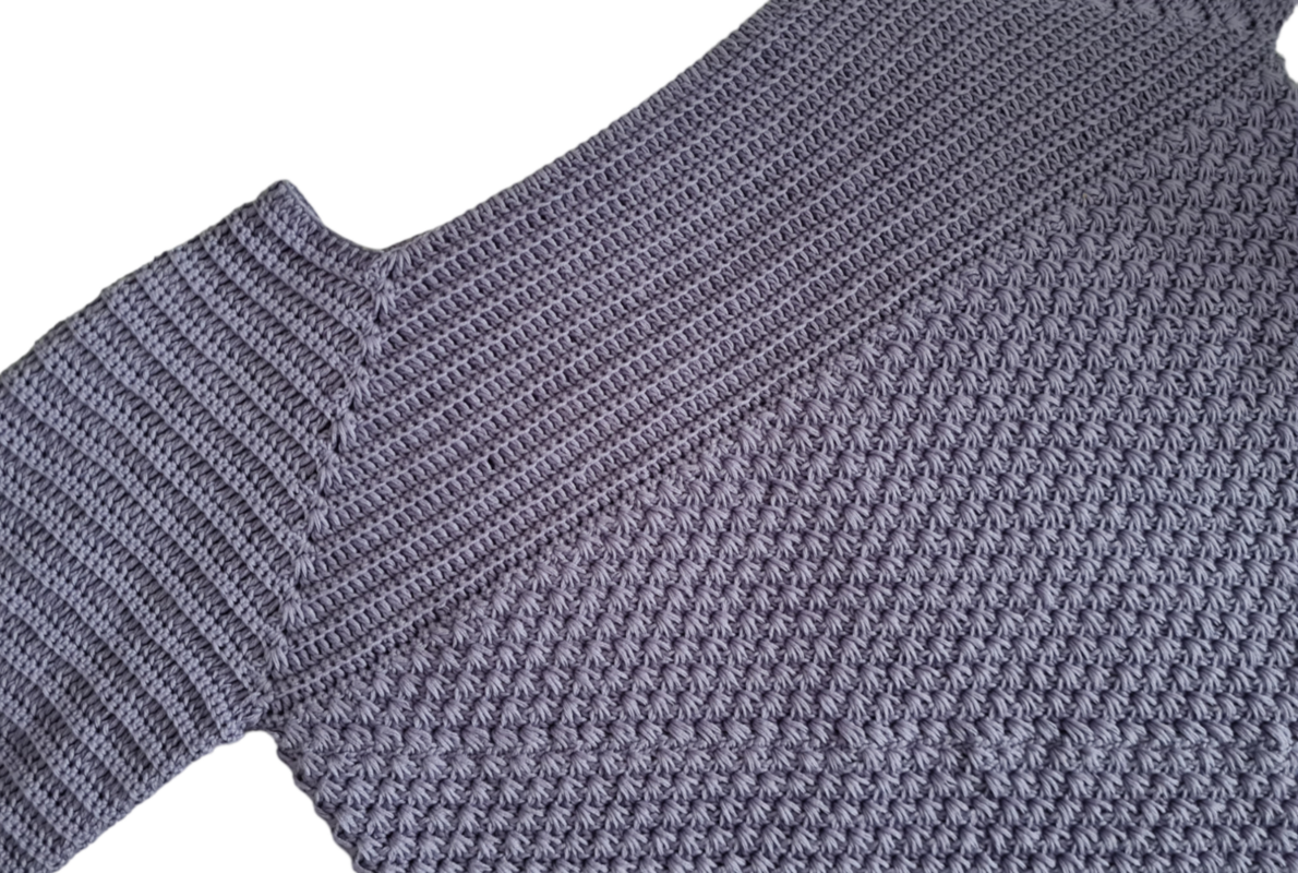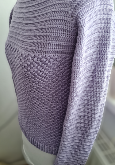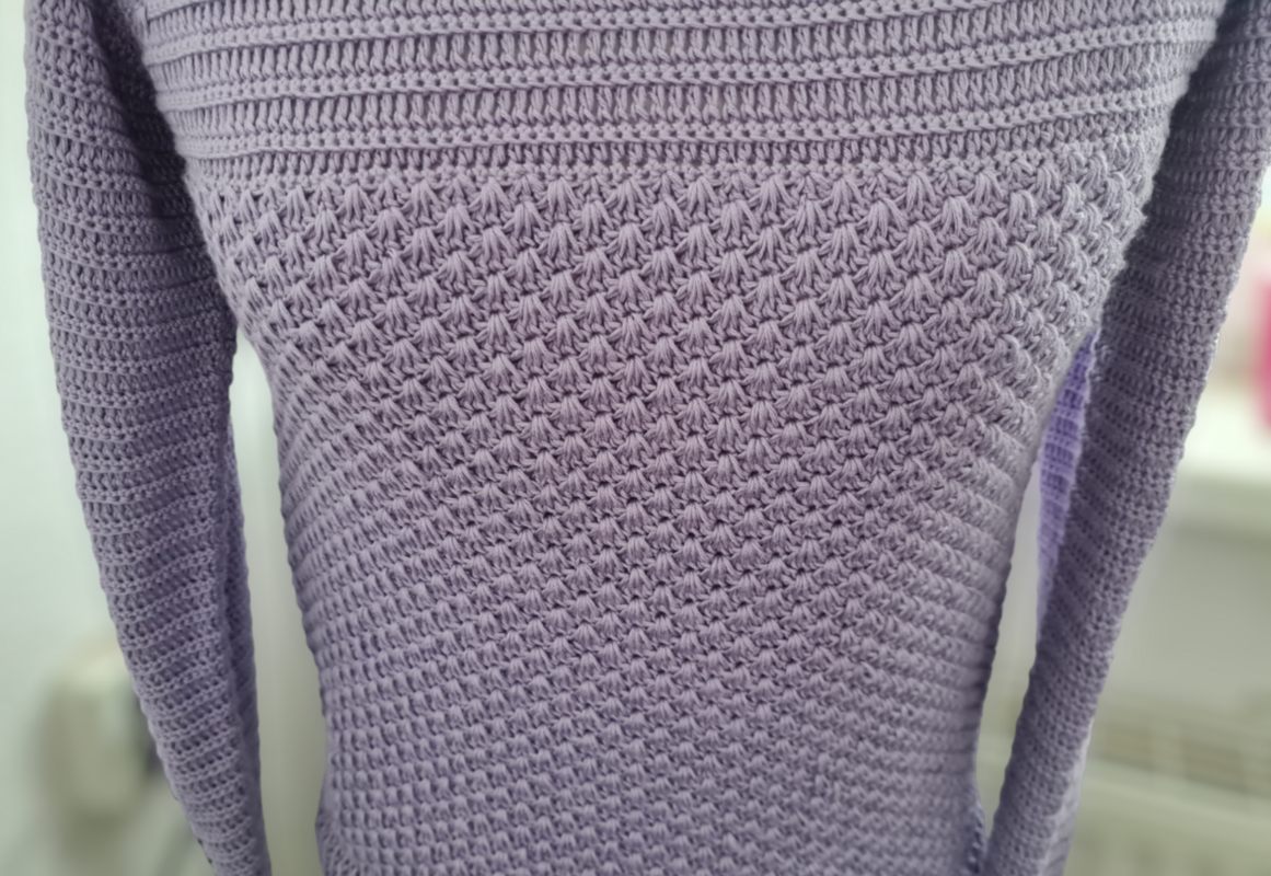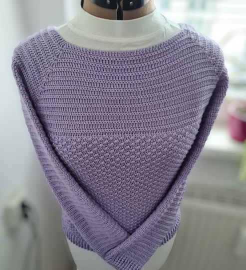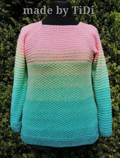 Er wird aus zwei unterschiedlichen, blickdichten Mustersätzen gehäkelt. Dank RVO kann der Pulli in jeder beliebigen Größe (auch Kindergrößen) und ohne lästiges Fäden vernähen gearbeitet werden. Die Muster gehen leicht von der Hand und prägen sich schnell ein.