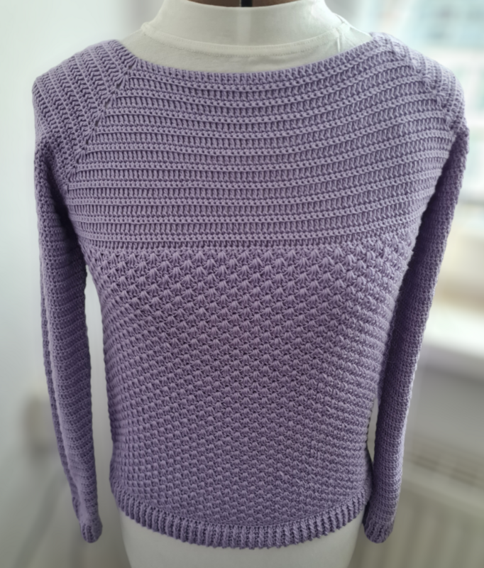 Der abgebildete Pullover wurde in der GrößeM gearbeitet.