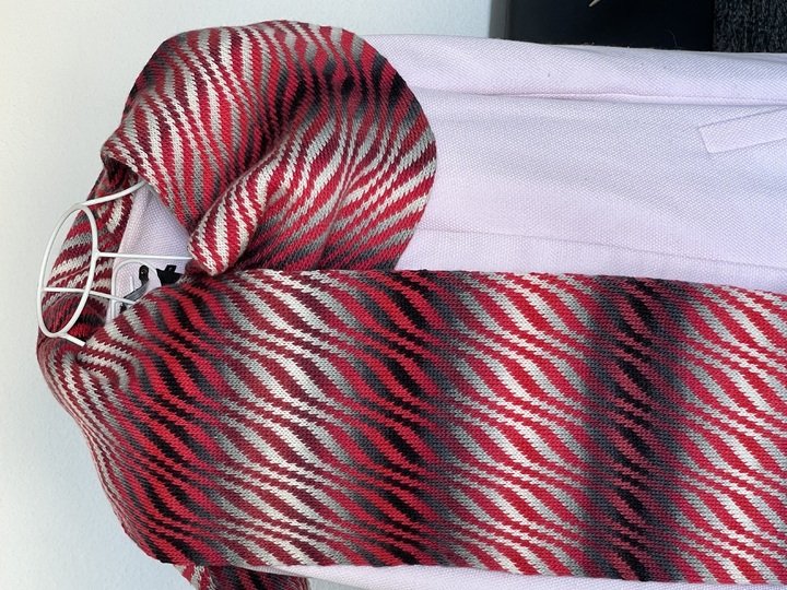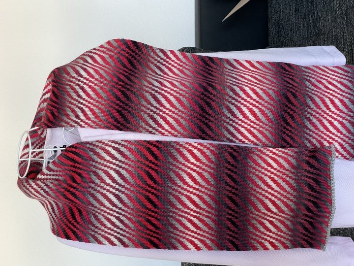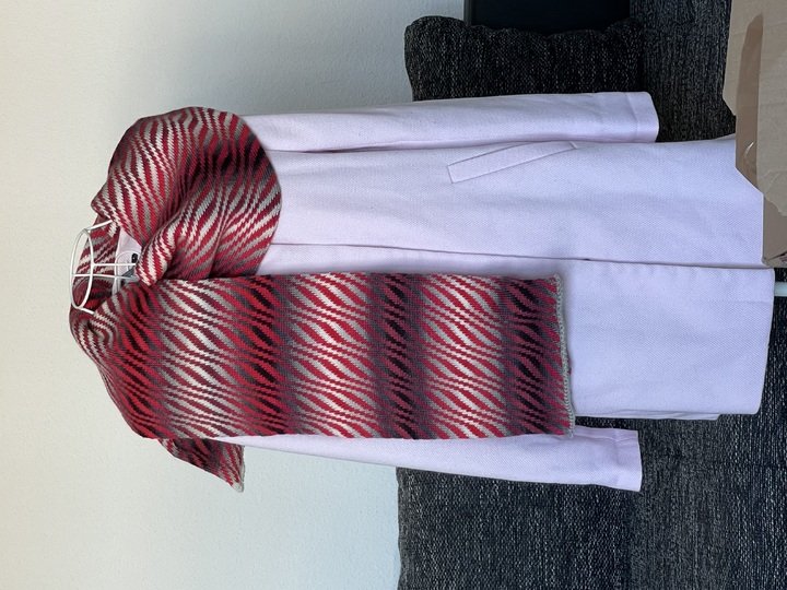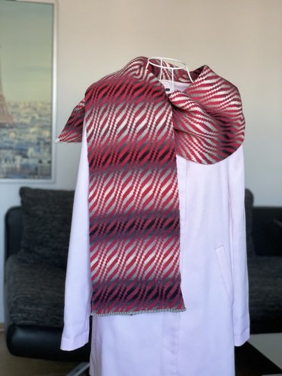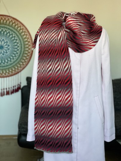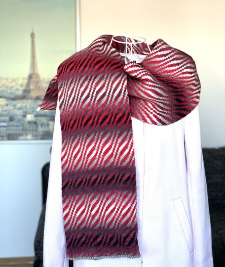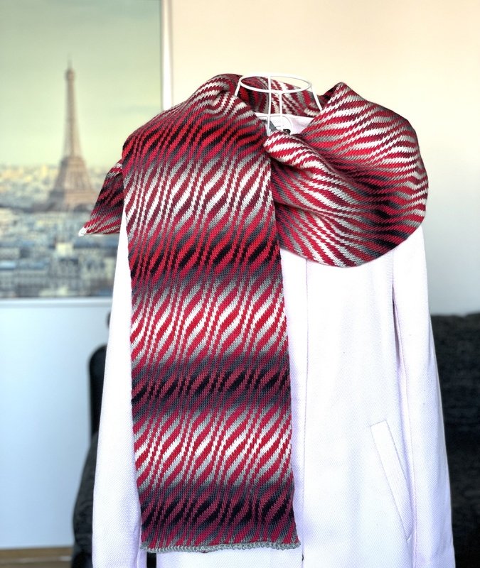 Die Stola wirkt in der Bewegung noch schöner. Die Illusionen kommen dann richtig zur Geltung. Das Modell wird in Norweger-Technik gestrickt.