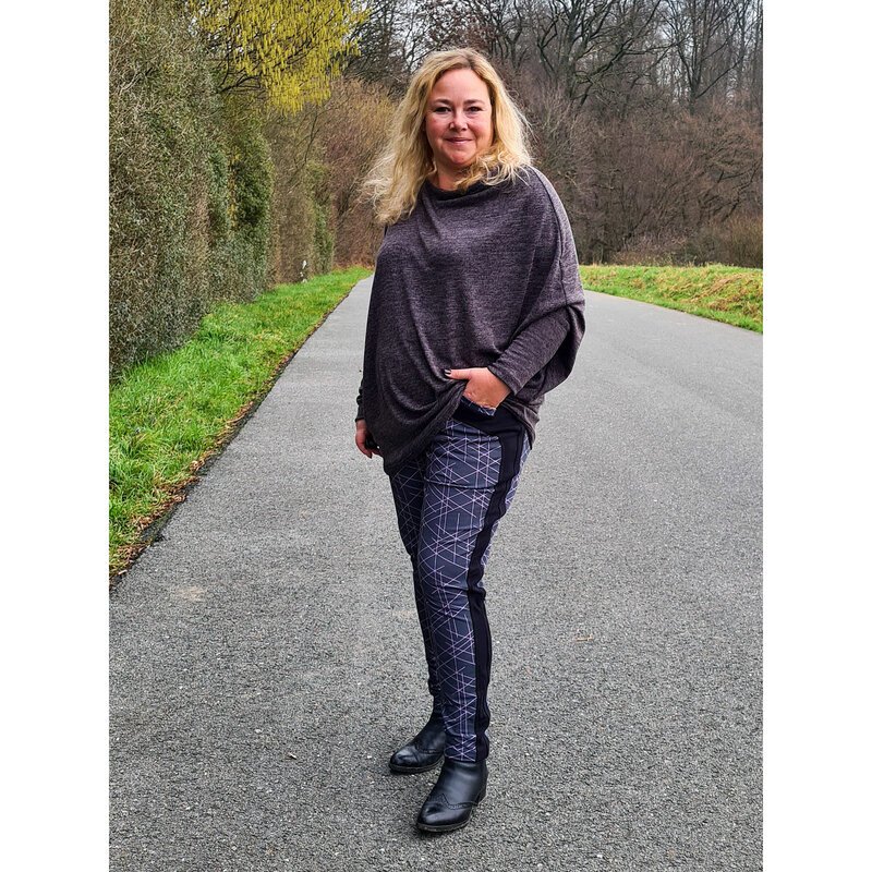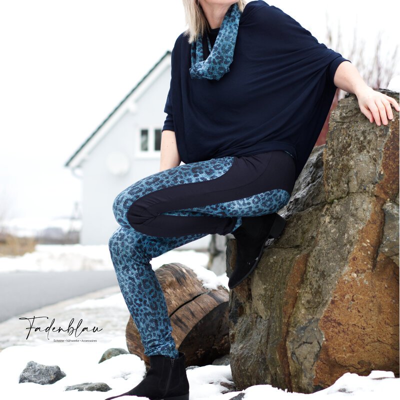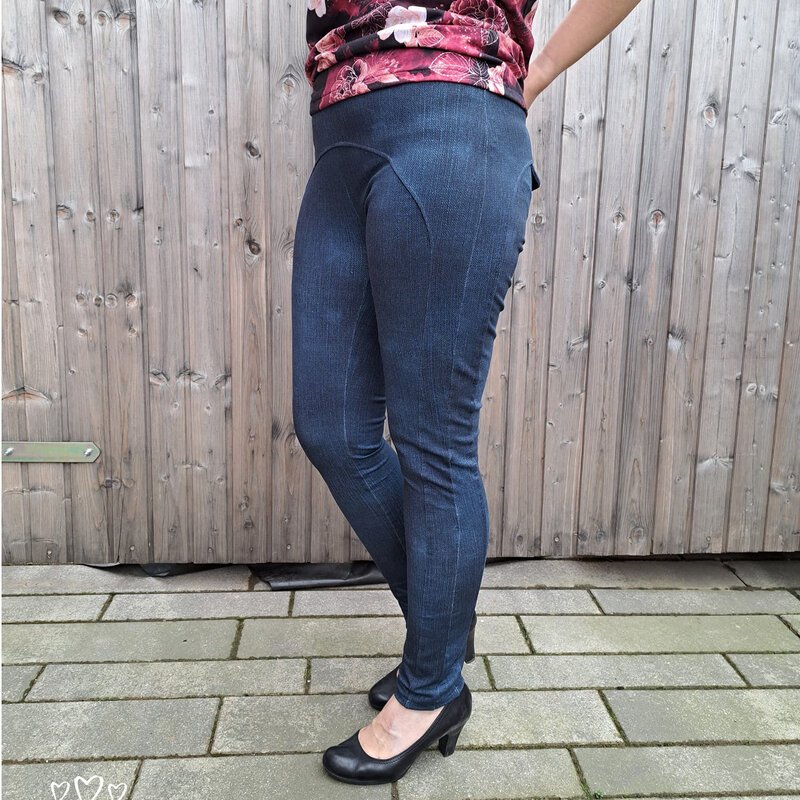 Das Besondere an der BlueJeggings ist die einseitige Teilung mit Passe und den Paspeltaschen.