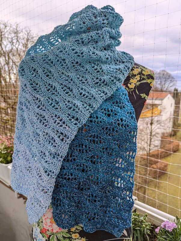 Der Schal "Eisbrecher" ist anfängertauglich, wenn man Erfahrung mit halben Stäbchen, Doppelstäbchen, festen Maschen und Luftmaschen hat.