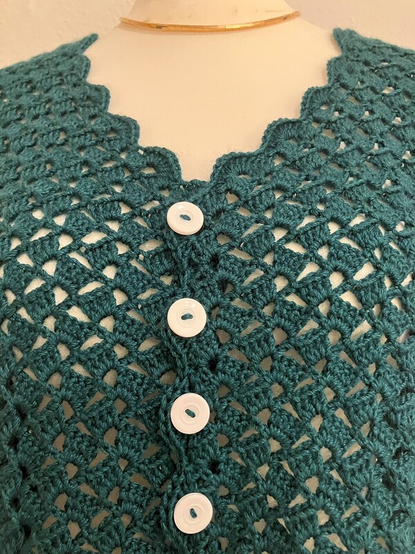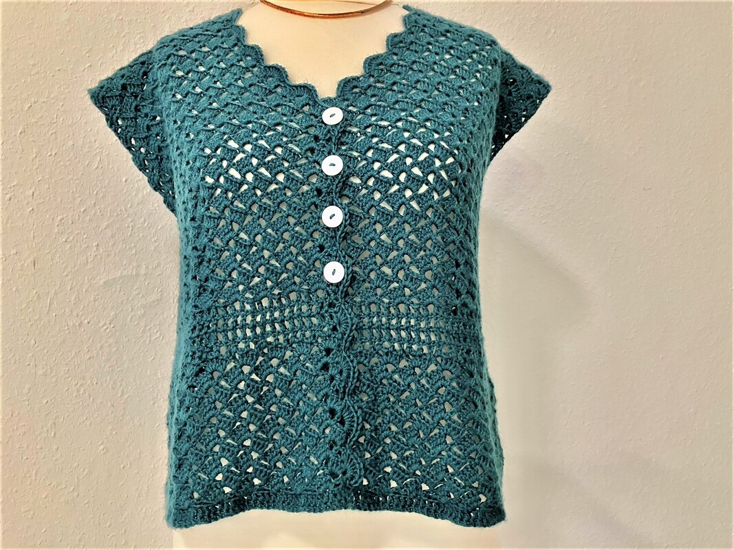Dieses Shirt ist in 3 Teilen gehäkelt: 2 Vorder- und 1 Rückseite. Die Knöpfe sind nur Zierde. Das Muster ist super-leicht zu häkeln. Überhaupt ist dies ein Topp, das schnell realisiert werden kann
