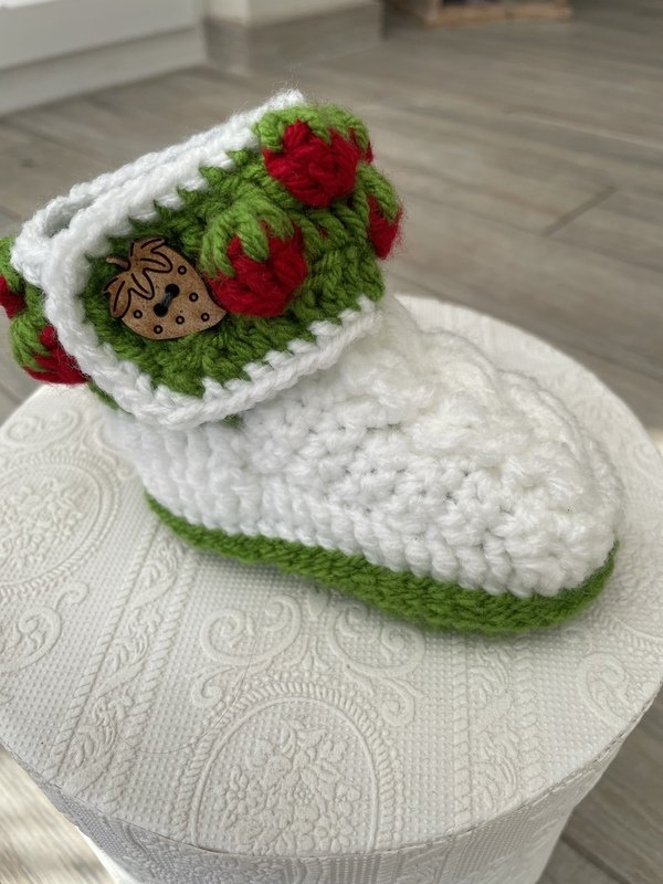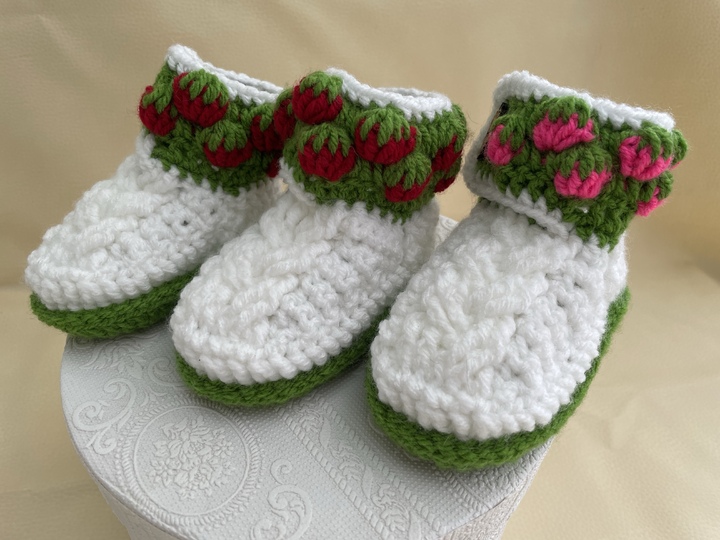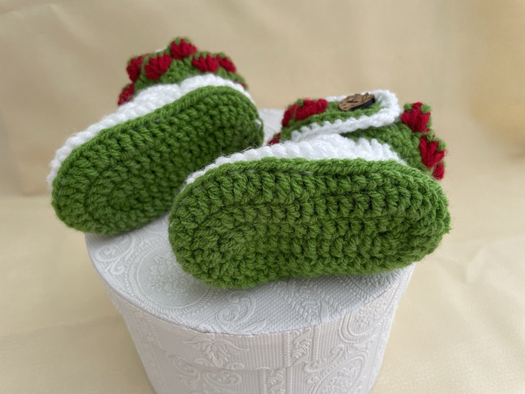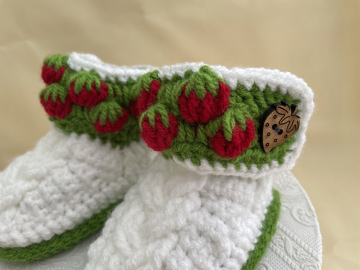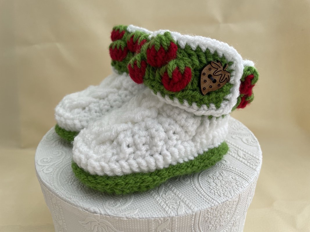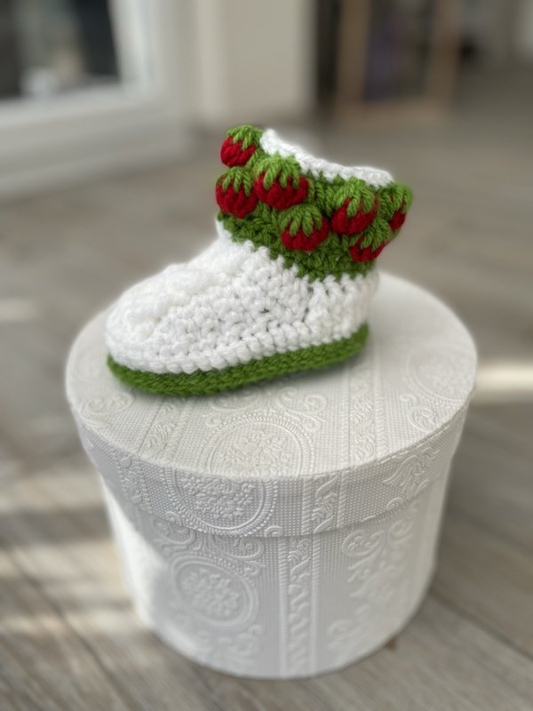 Diese gehäkelten Babyschuhe sind ein echter Hingucker. Doppelt gehäkelte Sohle, ein tolles Zopfmuster und dazu diese wunderschöne Erdbeer-Bordüre mit Knopf. Mit dieser Step by Step Anleitung kannst Du diese Schuhe nacharbeiten.