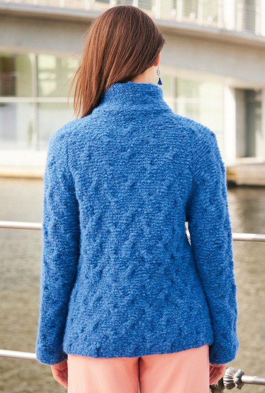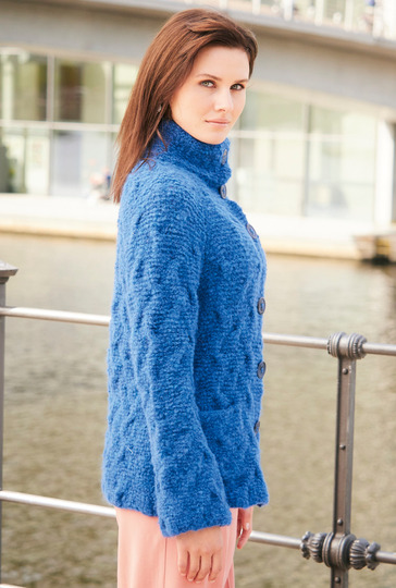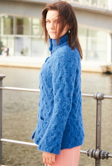 Die A-Form dieser in leuchtendem Royalblau brillierenden Raglanjacke garantiert einen perfekten Sitz im oberen Bereich und bequeme Weite um die Hüften. Die Trompetenärmel und der hohe Stehkragen geben ihr eine raffinierte Note. Durch das intensive Blau kommt das Zopfmuster, das nur andeutungsweise zwischen den kraus rechts gestrickten Maschen hervortritt, hervorragend zur Geltung. Die Jacke wird durchgehend mit großen Knöpfen geschlossen. Bouclé-Garn aus einer Schurwolle-Alpaka-Mischung wärmt schön an einem kühlen Tag. Eine Anleitung kann für die Größen 38/40, 42/44 und 46/48 downgeloadet werden.