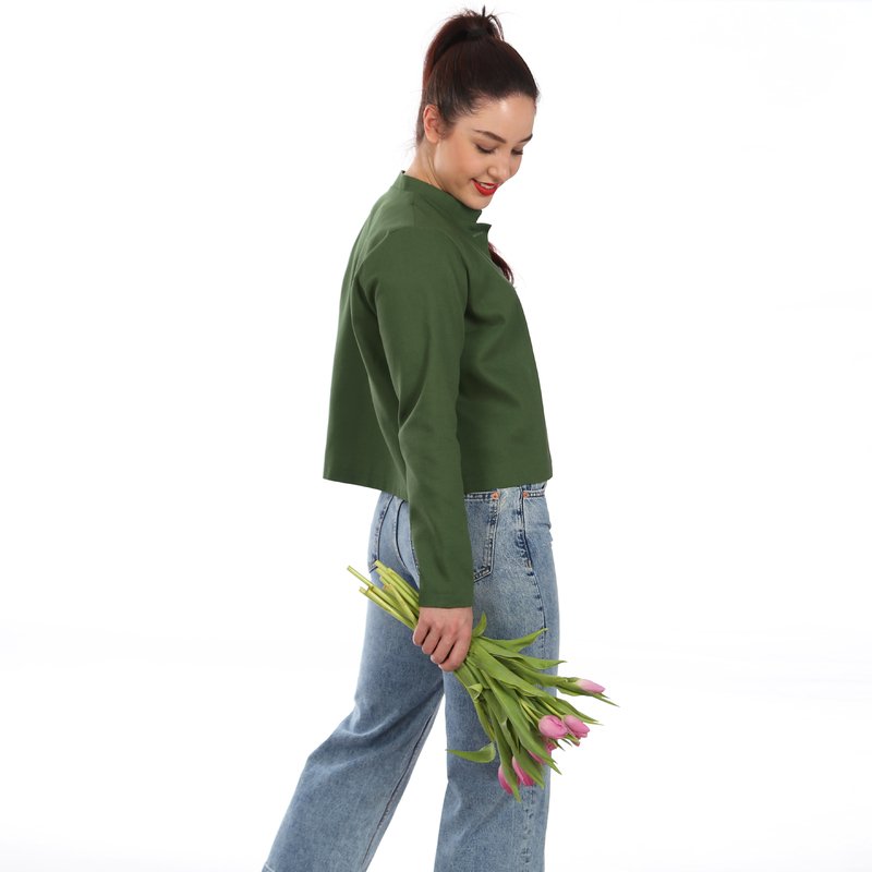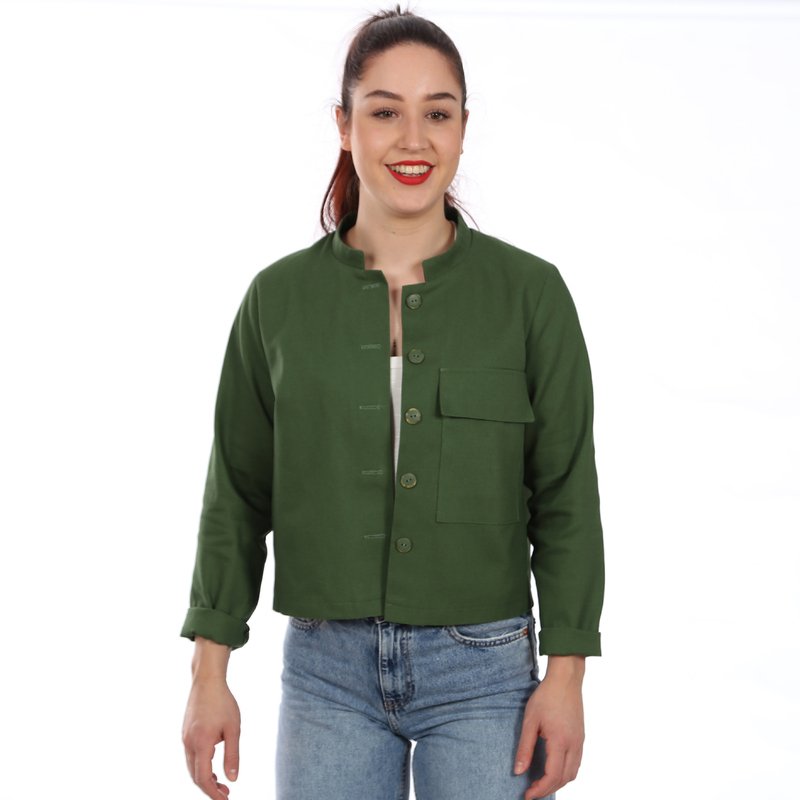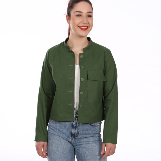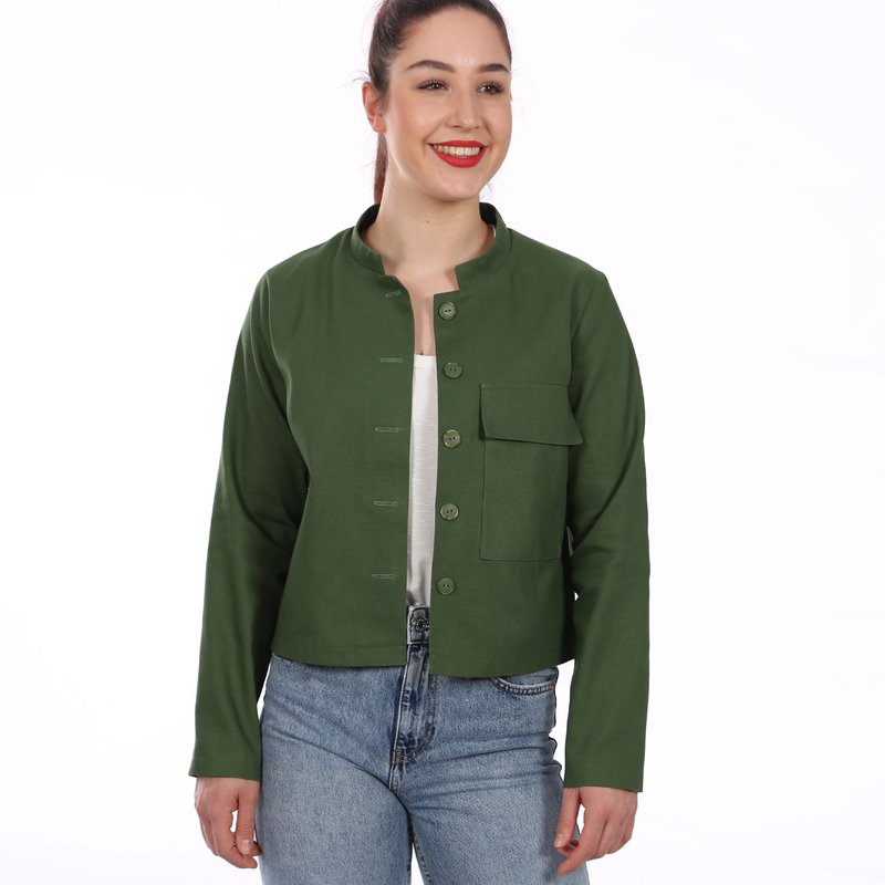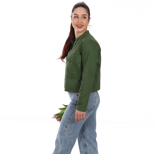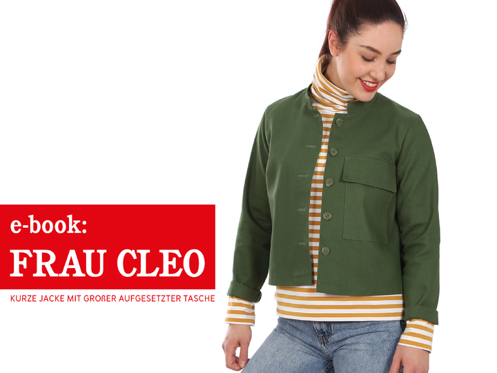 Die kurze, reduzierte Jacke FRAU CLEO ist die perfekte Begleitung für kühle Tage von Frühling bis Herbst. Mit dem Stehkragen und einer großen aufgesetzten Tasche mit Klappe ist sie chic und cool zugleich und kann zur Jeans genauso getragen werden, wie zum Rock. Zwei Ärmellängen sowie die Möglichkeit die Tasche auf beiden Seiten zu positionieren oder sie mal ganz wegzulassen, machen FRAU CLEO zusätzlich variabel.