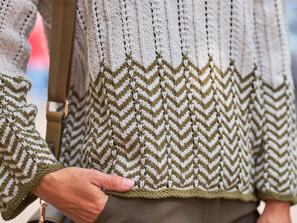 Dieser tolle Pulli hat ein besonders auffälliges Muster das durch die farbigen streifen noch betont wird. Der Schnitt ist ganz einfach, er kommt ohne Abnahmen aus. Darum ist es auch ganz einfach diesen kürzer zu stricken und als Kurzpulli zu tragen oder länger zu gestalten.