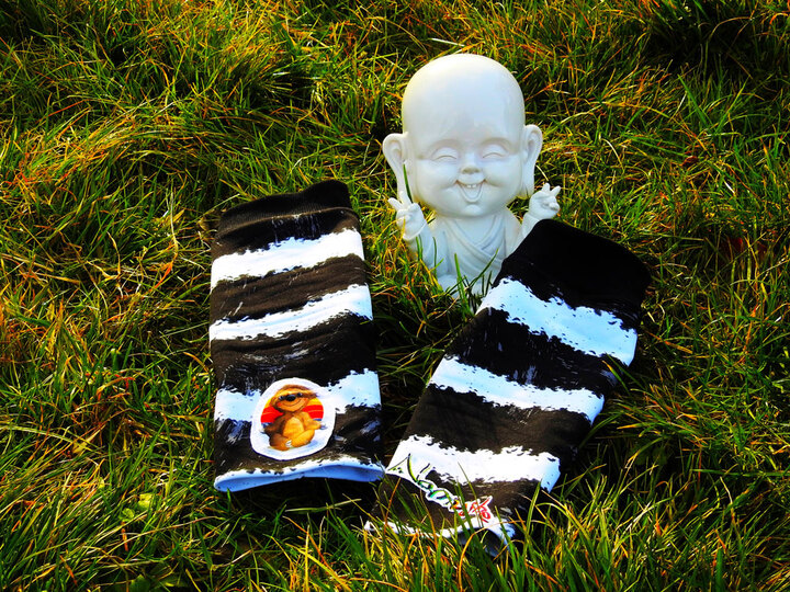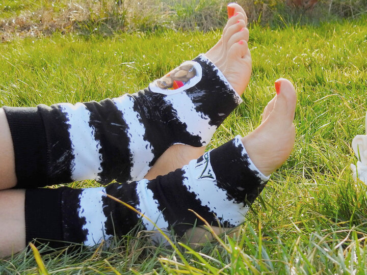 Vorsicht bei Motivstoffen: Die Socke wird ineinandergesteckt - es besteht die Gefahr, dass das Motiv am Ende auf dem Kopf steht. (Dann muss Du viel Handstand machen :]).