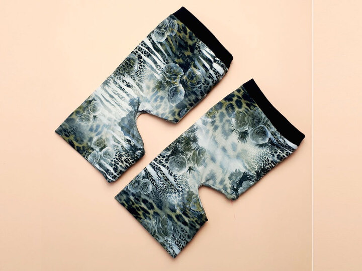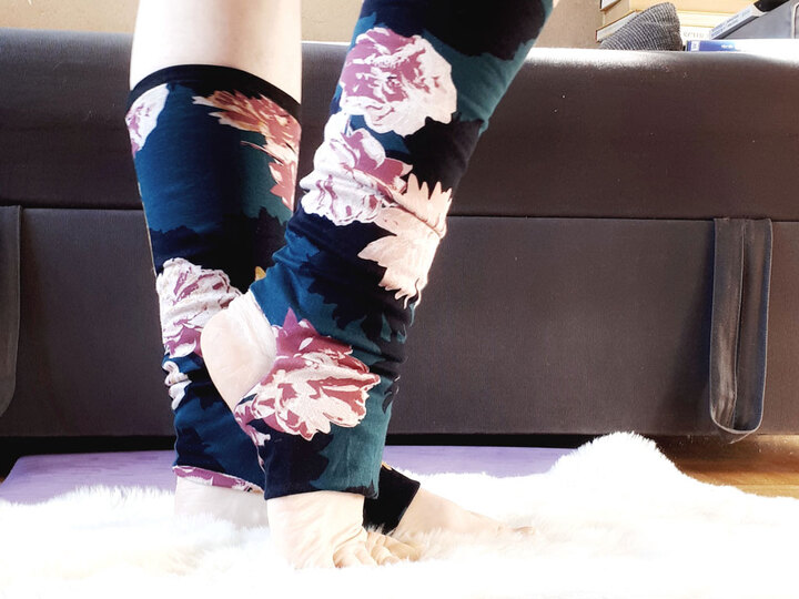 Die Yogasocken werden aus Jersey oder Sommersweat genäht. Für die kleine Größe (Knöchellänge) reichen Jerseyreste. Für die Kniestrumpf-Variante brauchst du ca. einen Meter bei ca. 40cm-45cm Stoffbreite.