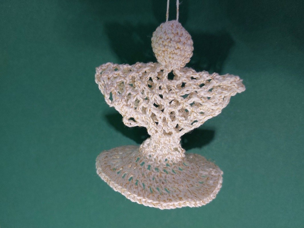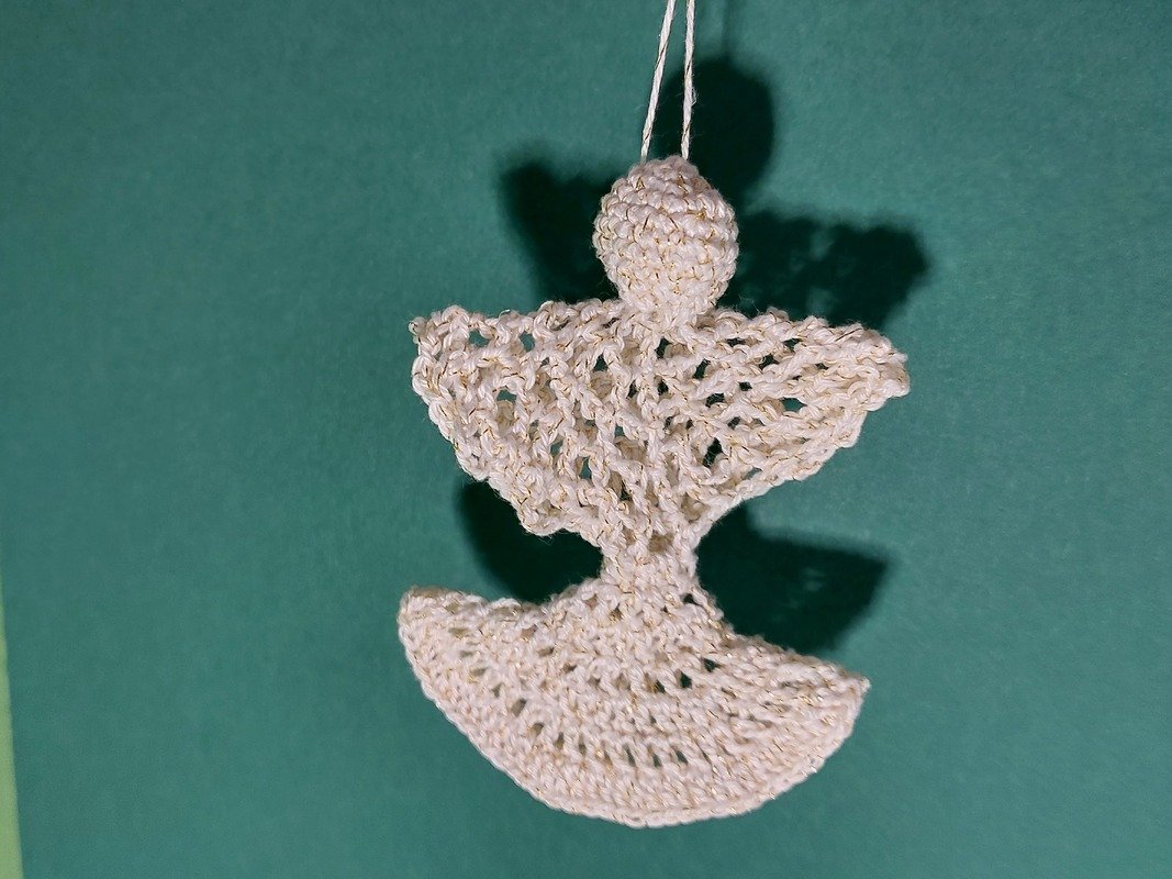 In der Nadelstärke 1,25 gehäkelt ist dar Engel ca. 6 cm groß.