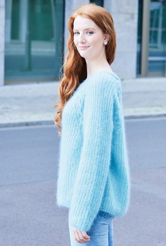 Wer liebt ihn nicht, den Lässig-Look? Hier als Körper umspielender Raglanpulli, dessen Schrägungen durch Zöpfe akzentuiert werden. Aus doppelt verstricktem Mohairgarn ein Stück mit Bestseller-Potential. Für etwas modisch unabdingbares Volumen sorgt das Halbpatentmuster. Dieses ist ganz unkompliziert zu stricken und in der Anleitung zudem detailliert Reihe für Reihe beschrieben. Für Übersicht bei den Zöpfen sorgt eine klare Strickschrift. Gestrickt wird in Einzelteilen von unten nach oben – sind alle Teile fertig, werden nur noch die Nähte geschlossen und der Halsausschnitt erhält seinen schmalen Rollrand.
