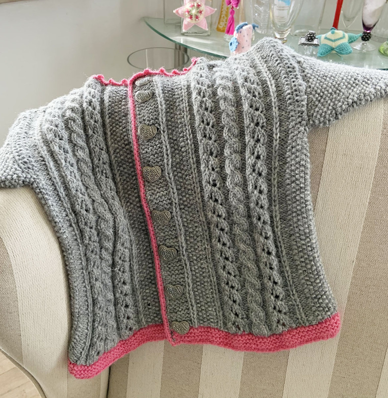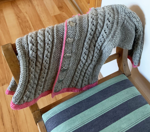 Die Trachtenjacke "Fini" ist nach meiner Enkelin Josephine benannt, die allerdings so schnell gewachsen ist, dass die Jacke nicht mehr passt. Sie ist in klassichem Grau gehalten und hat rosafarbene Bündchen - so ist sie einem Mädchen zuzuordnen. Wer für einen Jungen struicken will, nimmt statt Rosa einfach ein schönes Moosgrün. Die Muster sind trachtentypisch - Zöpfe und Lochreihen.