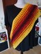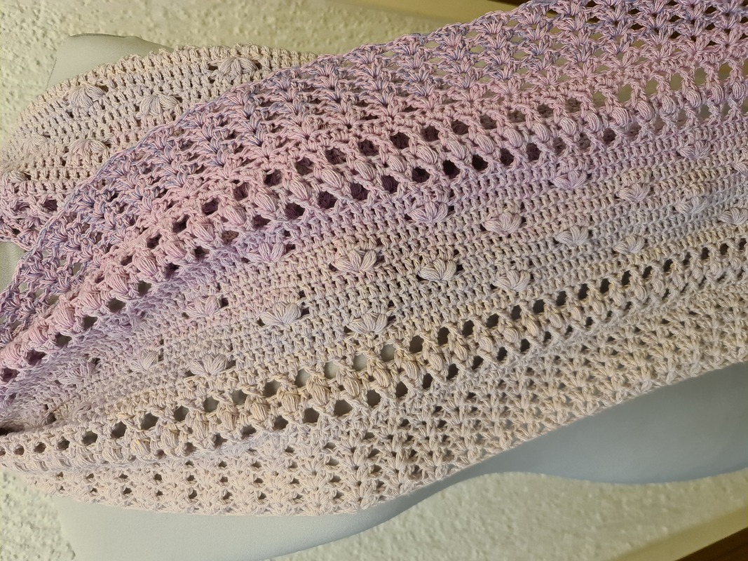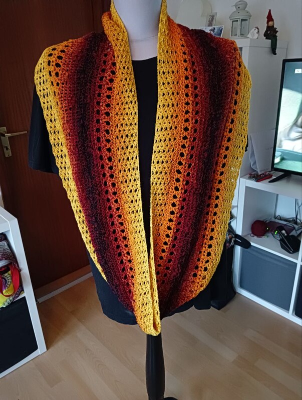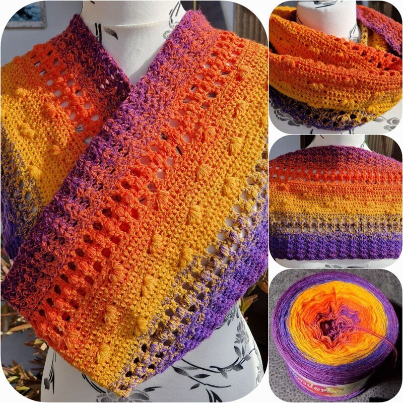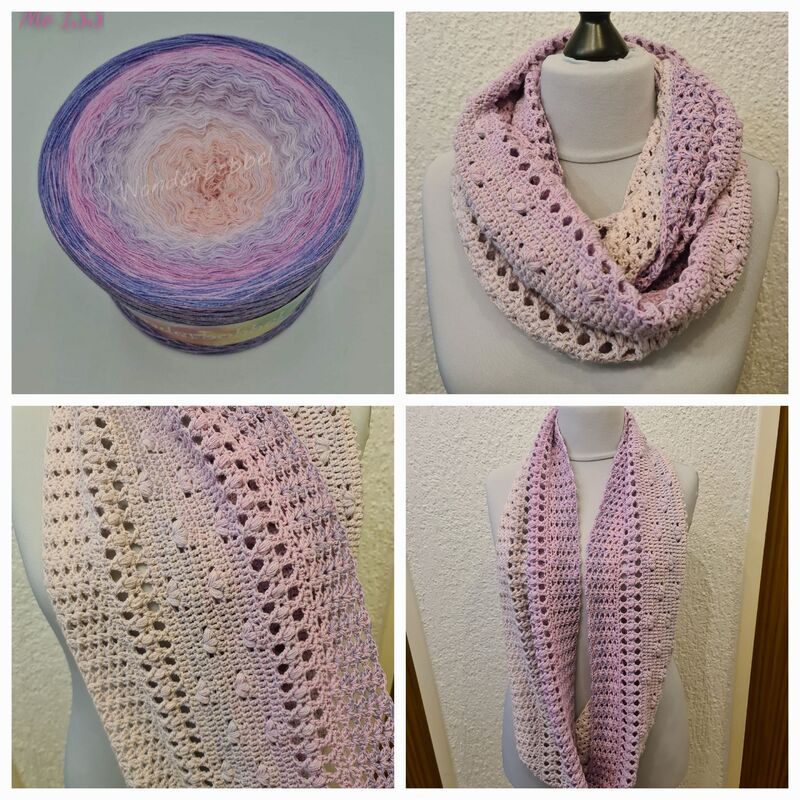 Wir haben den Loop mit einem 4 fädigen Bobbel von Wonderbobbel gehäkelt und er hat eine durchschnittliche Gesamtlänge von ca 1,60m und ca 80 cm Höhe.