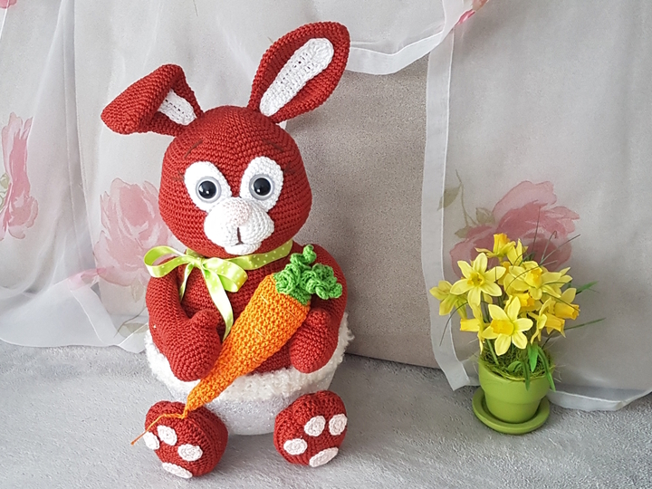 Nach Fertigstellung wird Häschen Benni ca. 36 cm groß (bei Verwendung der angegebenen Nadelgröße und Wollstärke).