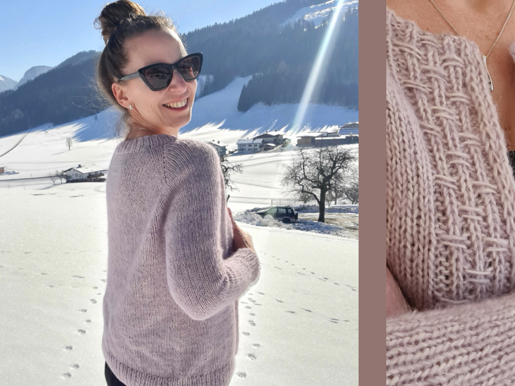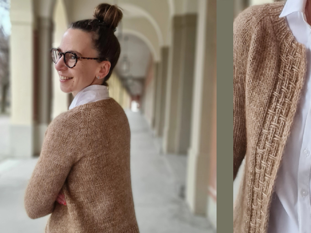 KOLINA wird in einem Stück von oben nach unten in einer Raglan-Konstruktion gestrickt. Für einen guten Sitz werden verkürzte Reihen gearbeitet. Die Ärmelmaschen werden stillgelegt und erst der Körper fertig gestrickt. Im Anschluss werden die Ärmelmaschen wieder aufgenommen und in Runden gestrickt. Bei den Ärmeln gebe ich dir zwei Möglichkeiten (enganliegend mit Abnahmen oder gerade geschnitten mit ballonartigem Abschluss), so dass du entscheiden kannst, was dir persönlich am liebsten ist bzw. am besten passt. Der Hingucker ist ein tolles Hebe-Muster, das entlang der Blenden an den Vorderteilen verläuft. Die Blende wird direkt mit angestrickt.