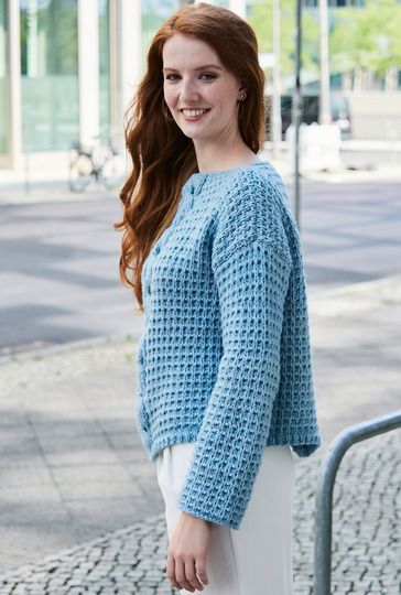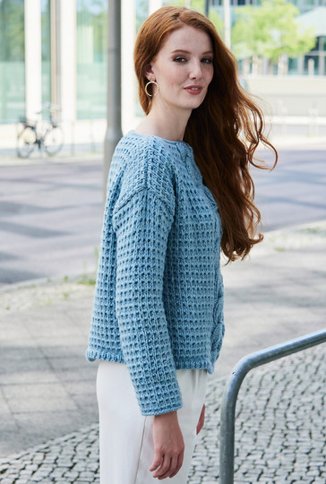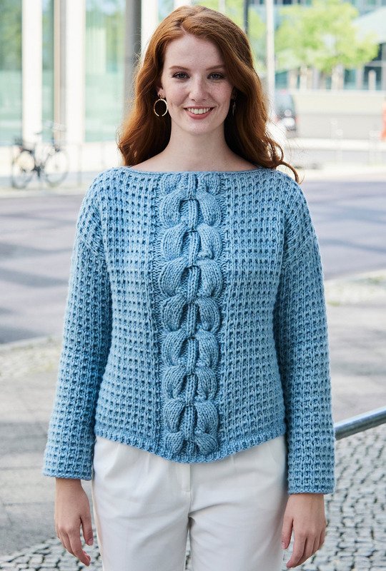 Das voluminöse Schurwoll-Baumwollgarn macht es Strickfans einfach. Denn mit dicken Nadeln geht die Arbeit flott von der Hand und der Sweater mit markantem Zopfstreifen entsteht im Nu. Der schlichte, gerade Schnitt erleichtert das Musterstricken zusätzlich – denn lediglich für die Ärmel müssen Zunahmen gearbeitet werden. Sowohl für das Strukturmuster als auch für den mittleren Zopf enthält die Anleitung eine übersichtliche und klare Strickschrift. Sind alle Teile fertig gestrickt, werden noch alle Nähte geschlossen und der Halsausschnitt mit einer Runde Kettmaschen sauber umhäkelt.