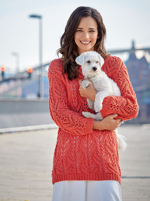 Mit strahlendem Korallenrot umgarnen wir den Frühling. Und mit Bio-Baumwolle, die mit ihrer leicht aufgerauten Oberfläche die schönsten Ajourmuster wirkungsvoll zur Geltung bringt. Gestrickt wird der Sommerpulli in einzelnen Teilen von unten nach oben, erst im Rippenmuster, danach im feinen Lochmuster. Das Ajourmuster braucht schon etwas Konzentration, ist jedoch nicht allzu schwierig und die übersichtliche Strickschrift hilft zusätzlich dabei, stets den Überblick zu behalten, das Rippenmuster ist ausführlich Reihe für Reihe beschrieben. Sind alle vier Teile fertig gestrickt, werden noch alle Nähte geschlossen und aus dem Halsausschnitt die Blende herausgearbeitet