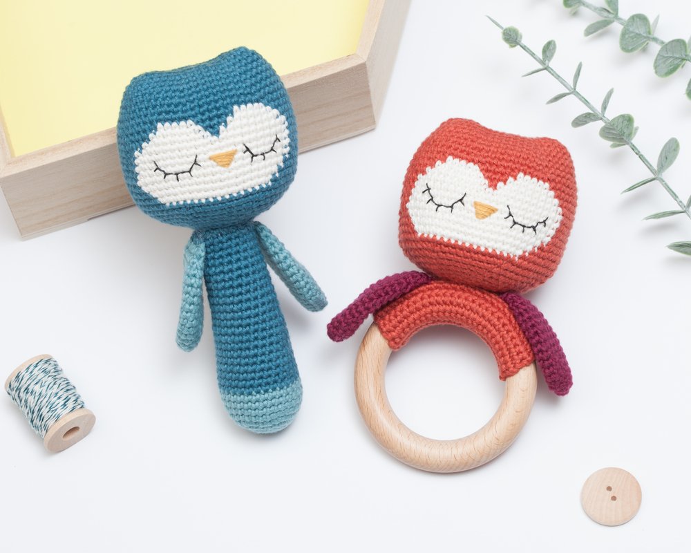 Wenn Du dasselbe Garn und dieselbe Häkelnadel verwendest wie ich, wird die Eulenrassel inklusive Holzring ca. 13,5 cm (5,3 Zoll) groß. Als Stabrassel wird sie ca. 14,5 cm (5,7 Zoll) groß. Du kannst es größer oder kleiner machen, indem du ein anderes Garn benutzt, passe aber dann die Häkelnadel entsprechend an.