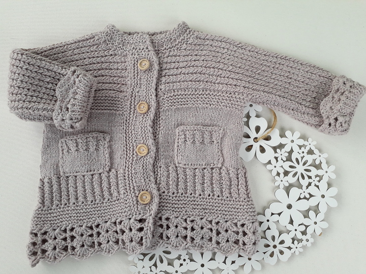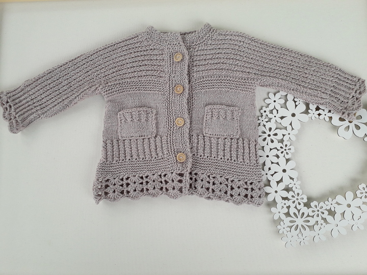 Die Jacke hat viele nette Details, wie Häkelborte, Stickerei am Rückenteil und 2 Taschen am Vorderteil. Diese Details kann man machen oder auch weglassen, ganz wie es einem gefällt. Man kann das eine oder andere Detail auch bei anderen Baby- oder Kinderjacken verwenden.