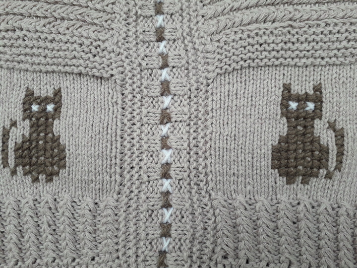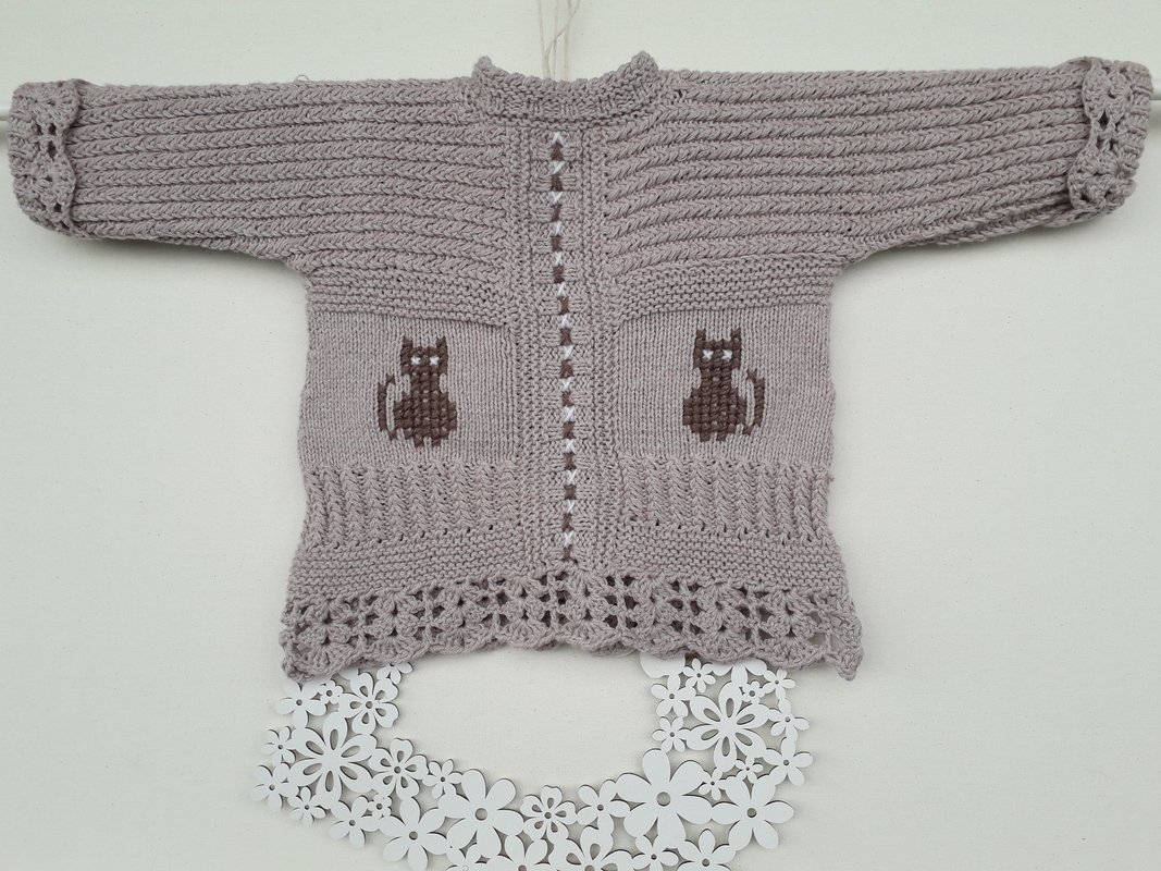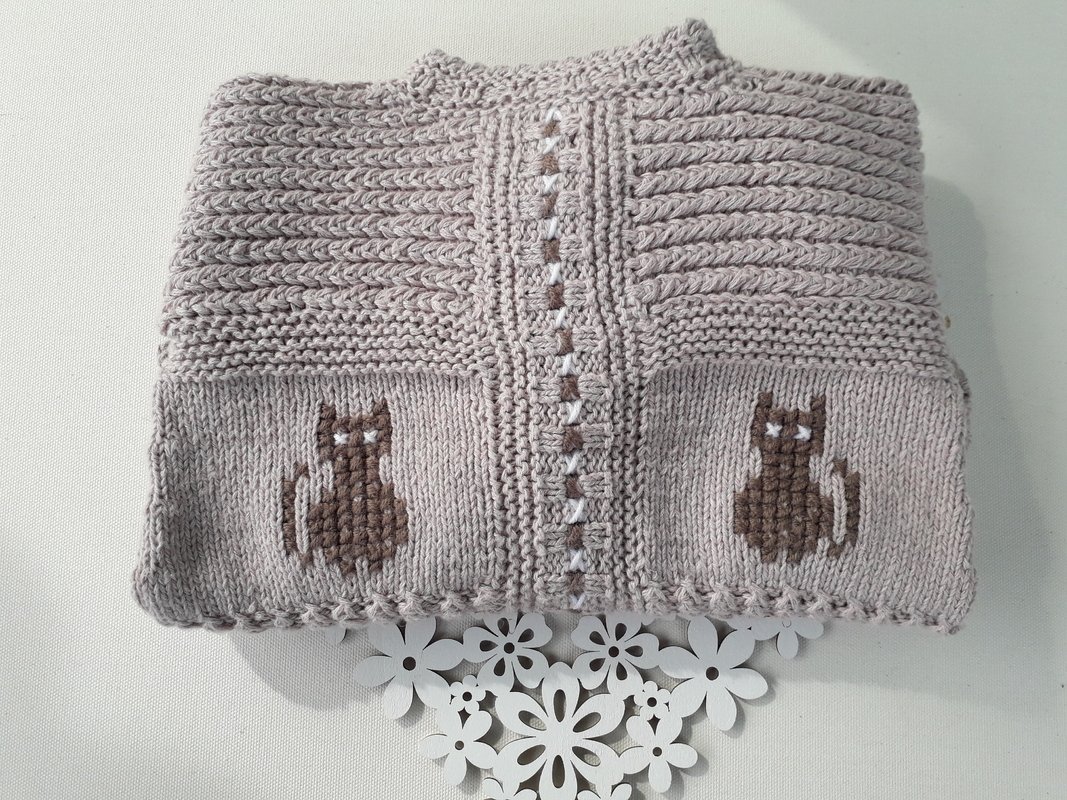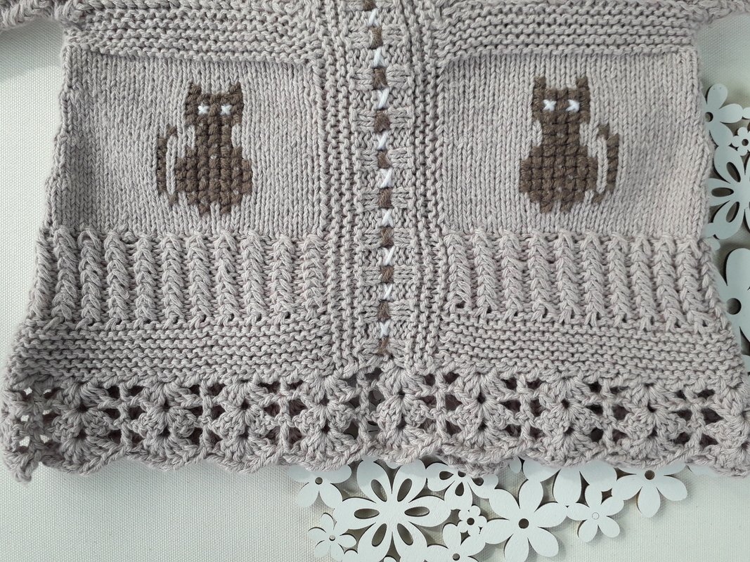 Hier bekommst du eine bis ins Detail erklärte 13-seitige Strickanleitung PDF-Datei in deutscher Sprache mit Fotos für eine süße Babyjacke, Baumwolljacke, Übergangsjacke für KatzenliebhaberInnen,