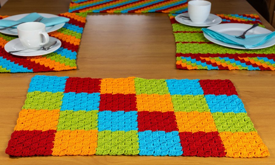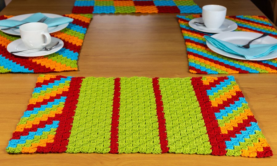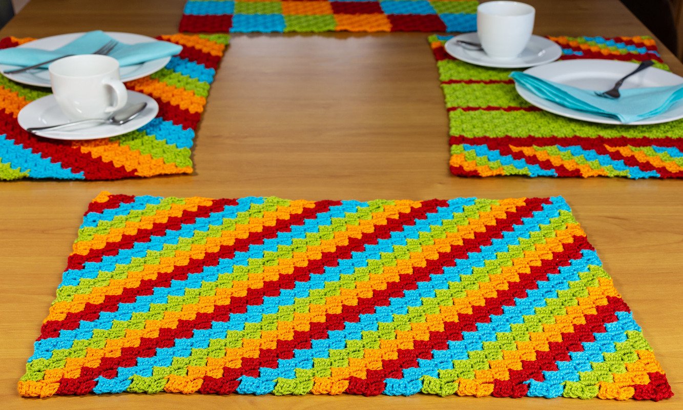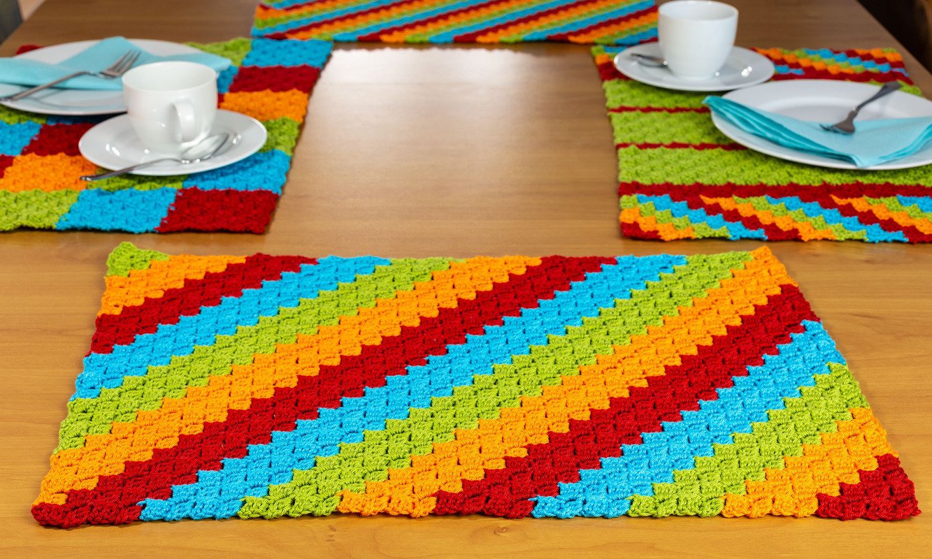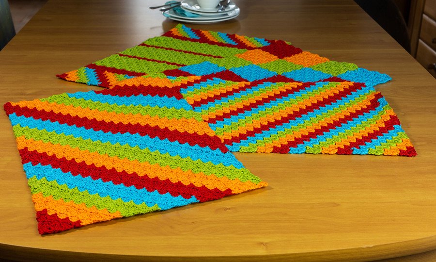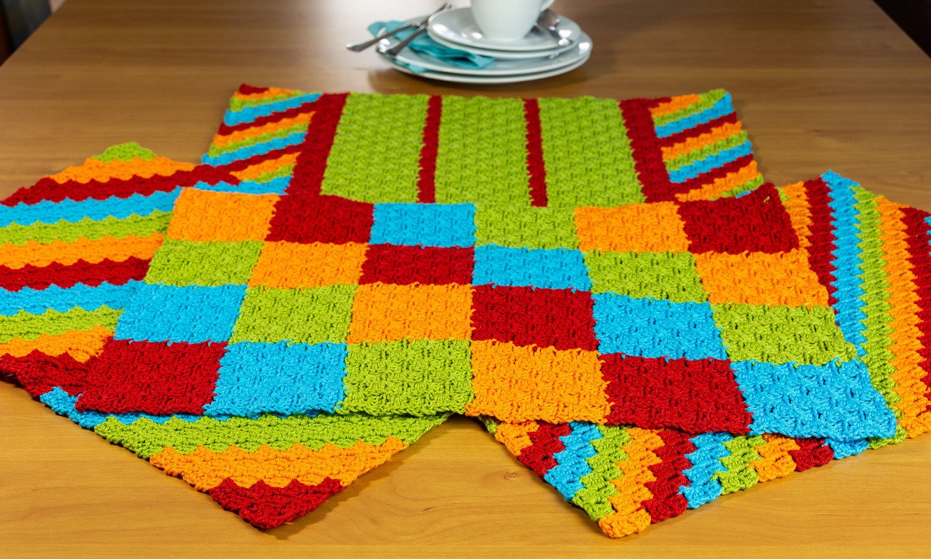 „Colorful“ ist ein Platzset in vier kräftigen Frühlingsfarben in vier verschiedenen Mustern in der Corner-to-Corner- (C2C)-Technik.