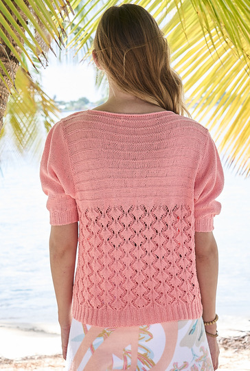 Unten ein transparentes Lochmuster, oben Kraus-rechts-Streifen, dazu ein tiefer V-Ausschnitt und auffällige Puffärmel – so bringt uns dieser Kurzarmpulli leicht und geschmeidig in Sommerlaune. Natürlich trägt auch das sommerliche Garn aus weicher, kühler Baumwolle und sanft fließender Viskose seinen Teil dazu bei. Gestrickt wird der feminine Pullover in vier Einzelteilen und von unten nach oben. Bei dem Vorder- und Rückenteil schließt sich nach dem Rippenbündchen direkt das zarte, transparente Lacemuster an. Das benötigt zwar ein wenig Aufmerksamkeit, aber die klare Strickschrift in der Anleitung hilft dabei, stets den Überblick zu behalten. Unter der Brust angelangt, erfolgt dann der Wechsel vom Ajour- zum Querrippenmuster. Die Ärmel werden dann einfach glatt rechts gestrickt. Ist alles fertig gestrickt, werden die Schulternähte geschlossen und die stillgelegten Maschen des hinteren Halsausschnitts mit einer zarten Blende im I-Cord-Stil abgekettet, dann die Ärmel mit eingehaltenen Falten eingesetzt und die restlichen Nähte geschlossen.