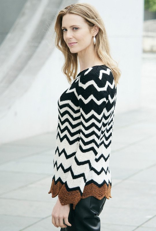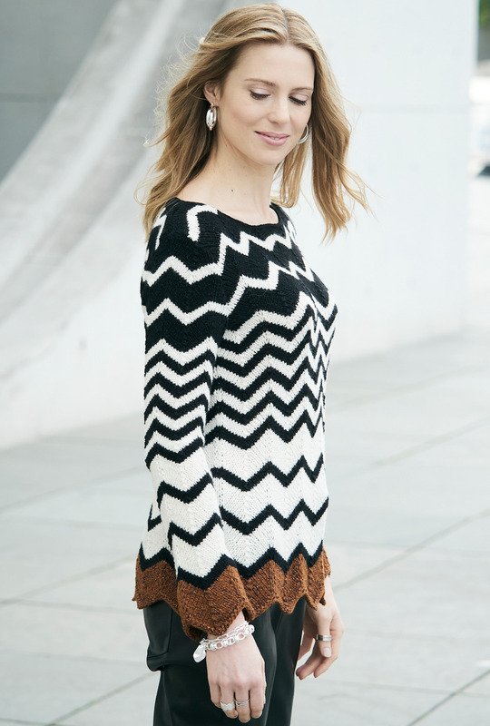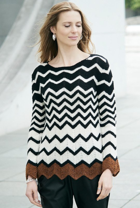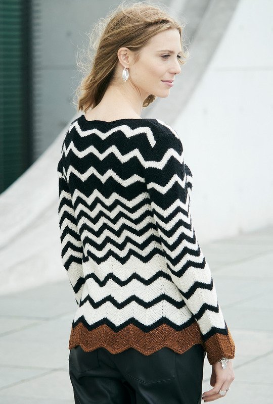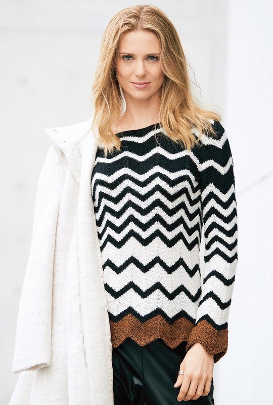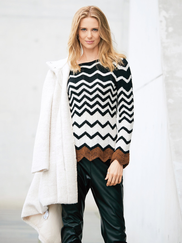 Die spannende Optik dieses Pullis entsteht durch das schwarz-weiße Zackenmuster, das durch nougatfarbene Blenden vervollständigt wird. Der Clou: ein Lurex- Beilaufgarn bringt dezenten Glam in die Masche. Mit Nadelstärke 5,5 ein zügiges Strickvergnügen – zumal das Merinogarn angenehm über Hände und Nadeln streicht – so ist auch das Stricken des Musters gar kein Problem. Gestrickt wird in einzelnen Teilen von unten nach oben. Die Muster- und Streifenfolge ist nicht kompliziert und Reihe für Reihe in der Anleitung ausführlich beschrieben.