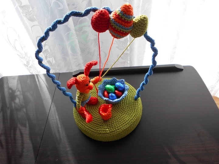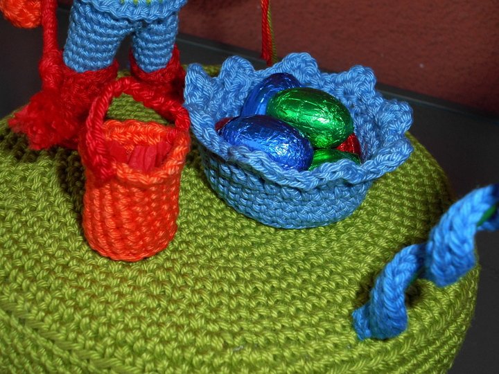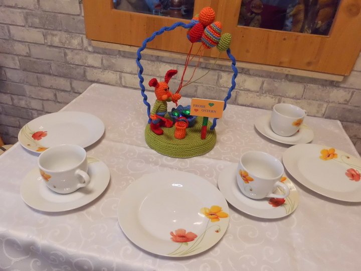 Das Gesamtwek hat eine Höhe von ca. 29cm und oben einen Durchmesser von 22cm. Der Hase hat mit seinen Ohren eine Größe von 14cm und das größte Ei ist 7cm. Der Eimer wird 3,5 cm hoch und die Schale/Korb 3,5cm. Sie hat einen Durchmeser von 7cm und der Eimer 3. Die Wiese hat einen Durchmesser von gut 17cm.