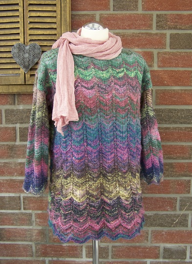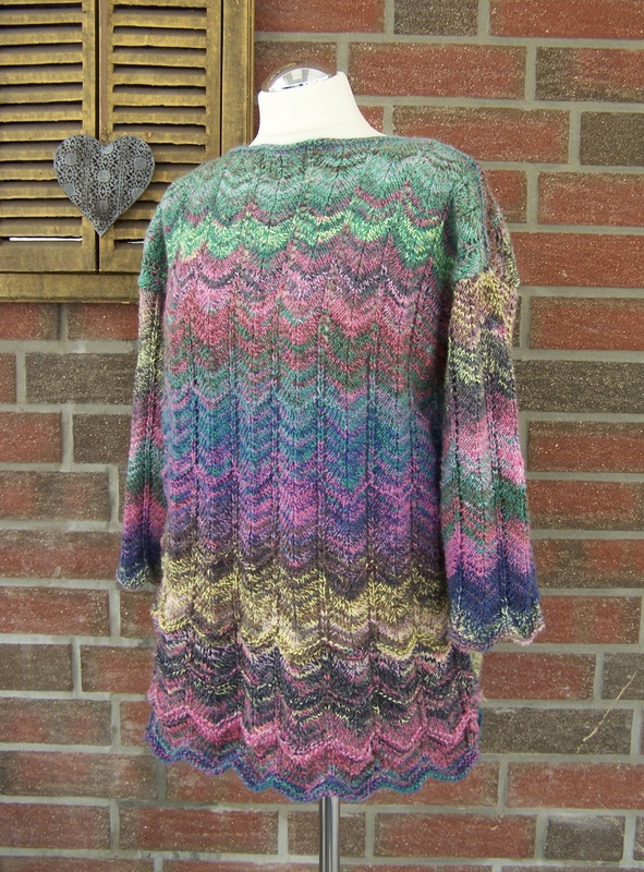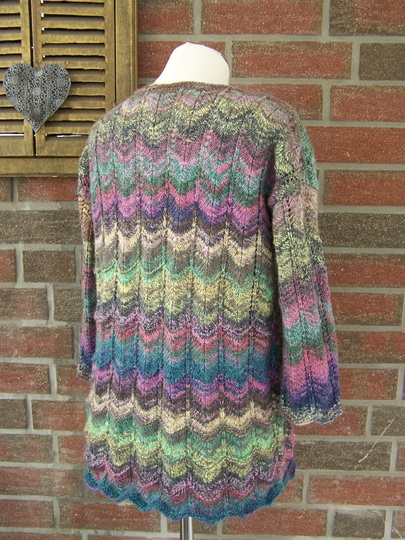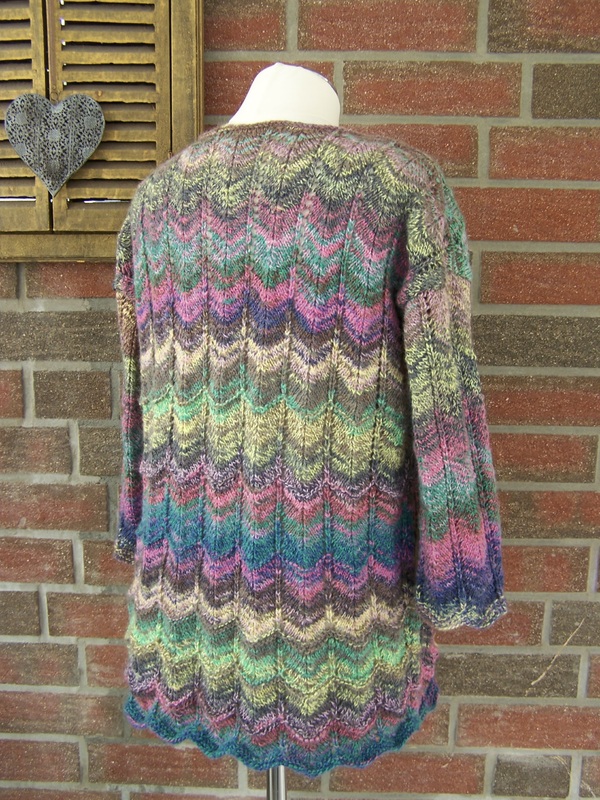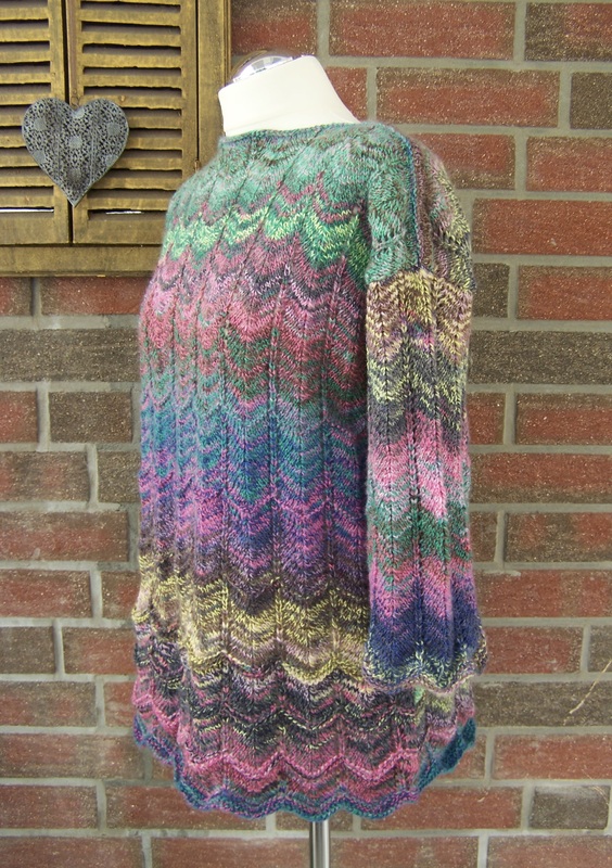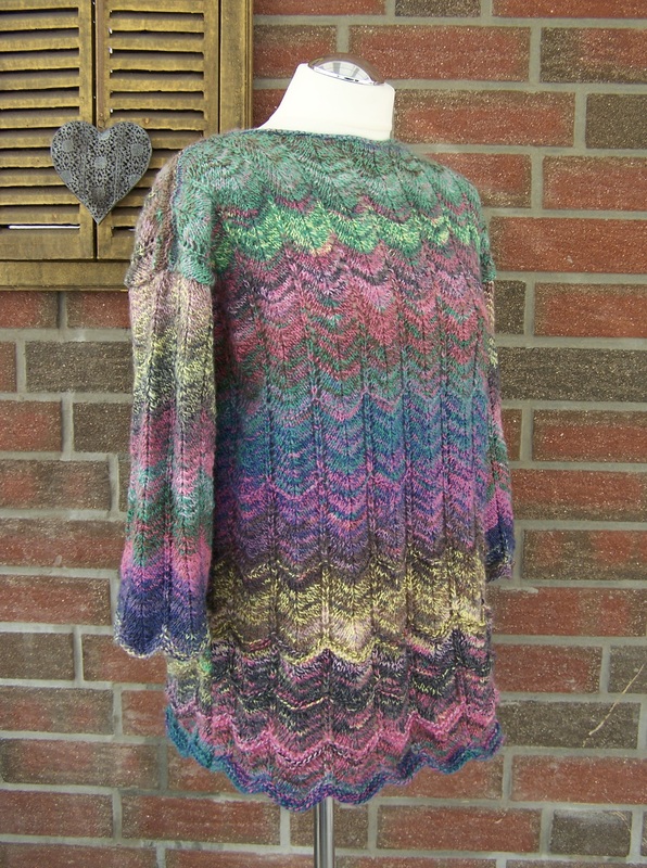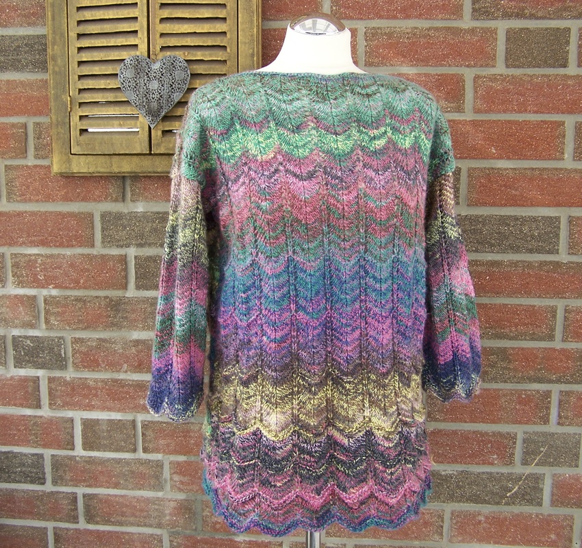 Durch den Musterverlauf (Wechsel zwischen kraus rechts und Fischgrätenmuster in unterschiedlichem Abstand) erhält der Pullover eine leichte A-Form.