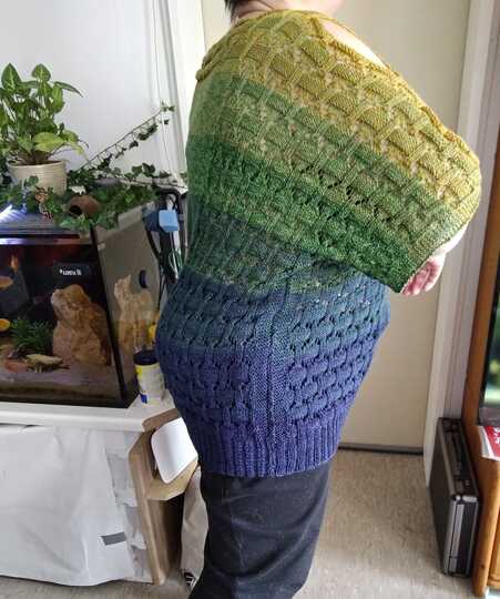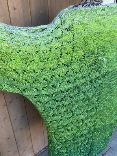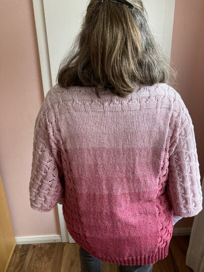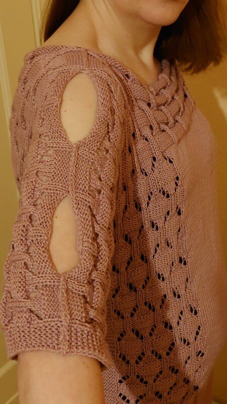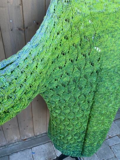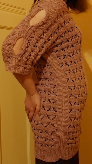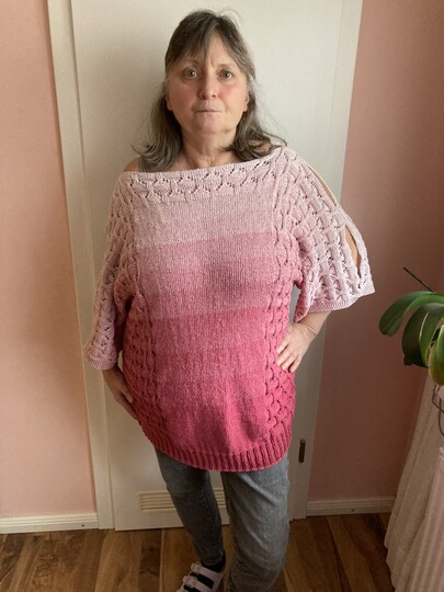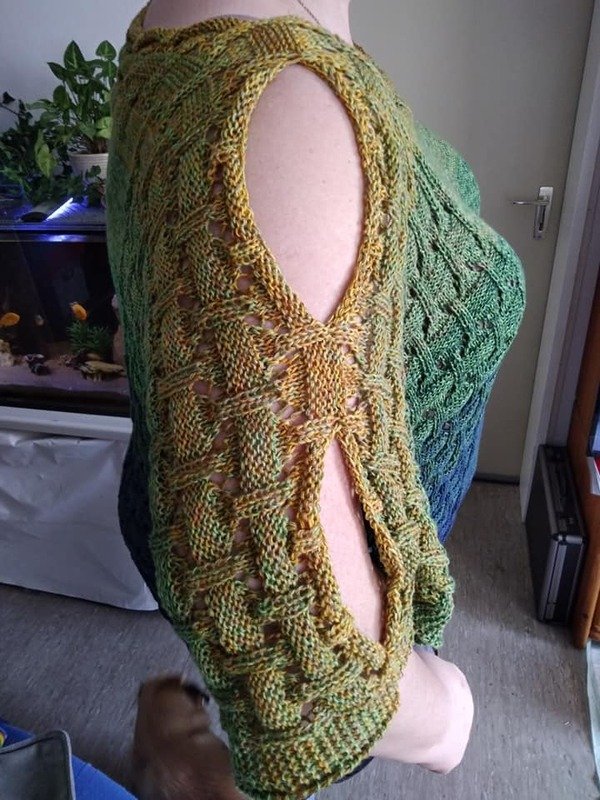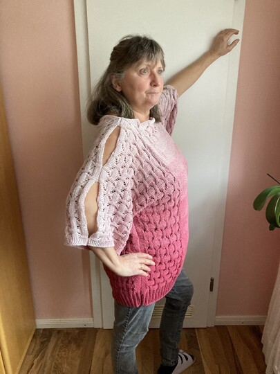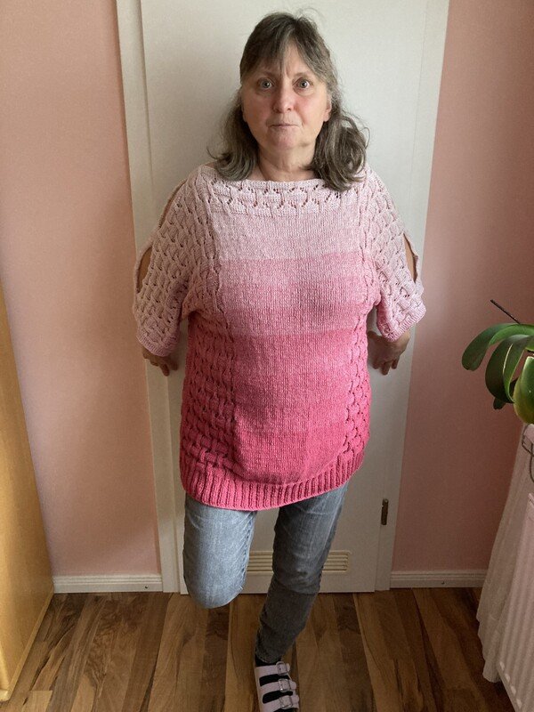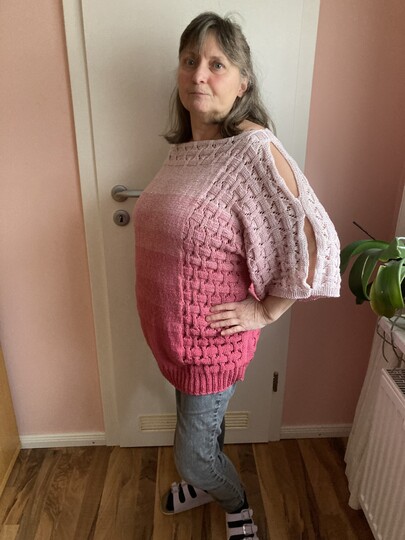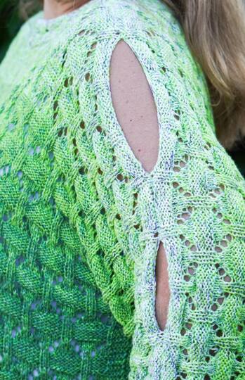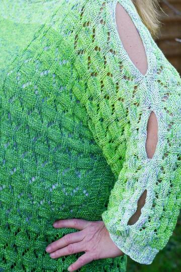 Das Oberteil wird in zwei Teilen von unten nach oben gestrickt. Dabei werden individuell ab halber Höhe die Maschen für die Ärmel mit aufgenommen. Oben strickst Du beide Teile zusammen und lässt einige cm frei für die Cutouts und den Ausschnitt. Das Ajourmuster läuft dezent an den Rumpfseiten, auf den Armen und um den Ausschnitt herum.