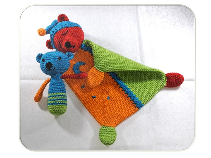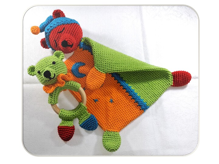 Bei diesem Artikel handelt es sich um eine bebilderte, detaillierte PDF-Anleitung für die komplette Bärenbande bestehend aus Schmusetuch, Greifring, Rassel und Schnullerkette mit 23 Seiten und zahlreichen Bildern.