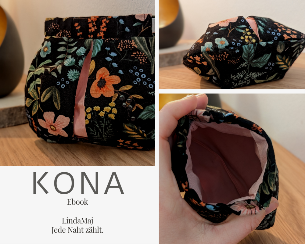 Du kaufst hier eine digitale Anleitung mit Schnittmuster im PDF-Format zum Selbstausdrucken und Selbstnähen. Sie kaufen kein fertiges Täschlein "Kona".