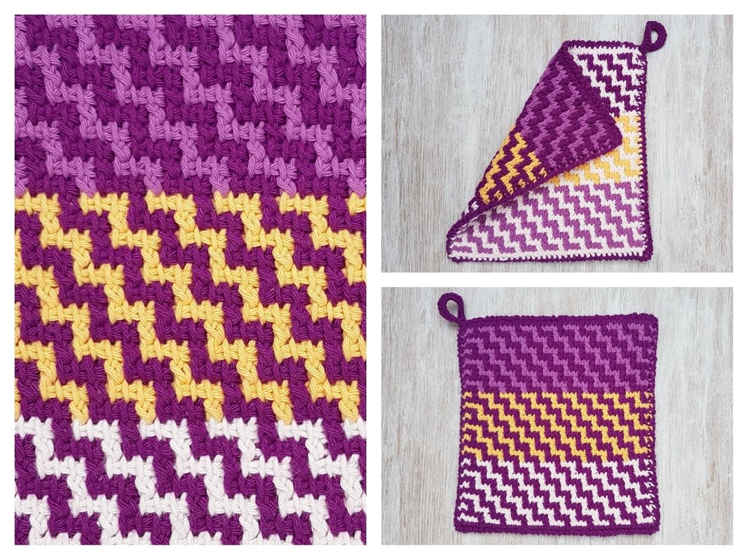 Tunesisch gehäkelte Topflappen SCALA im Mosaik-Muster