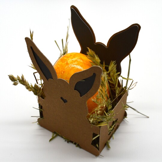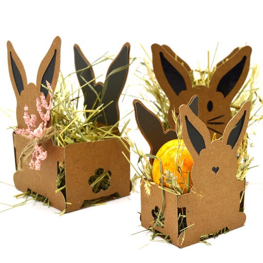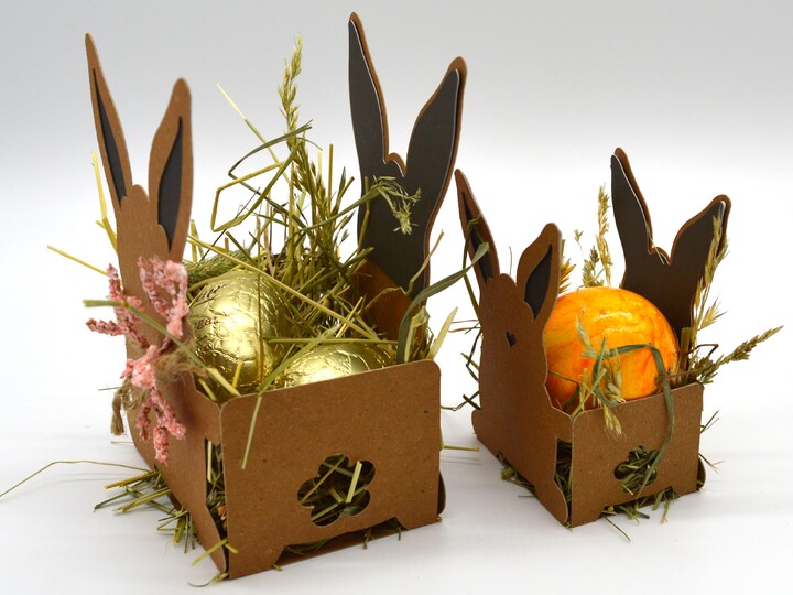 Geschnitten und gefalten aus Karton/ Kraftkarton ergeben es süße, kleine Nester, die mit Heu, Stroh, Eier und Süßigkeiten befüllt werden können.