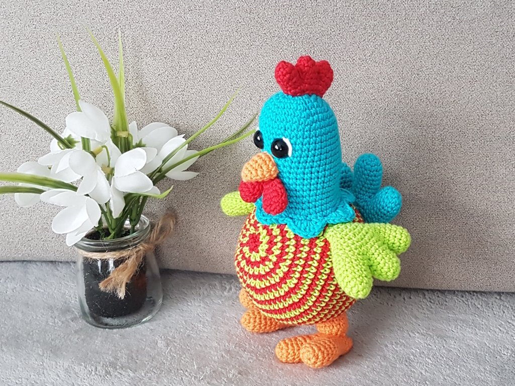 Nach Fertigstellung werden die beiden Hühnchen ca. 14 und 18 cm groß (bei Verwendung der angegebenen Nadelgröße und Wollstärke).