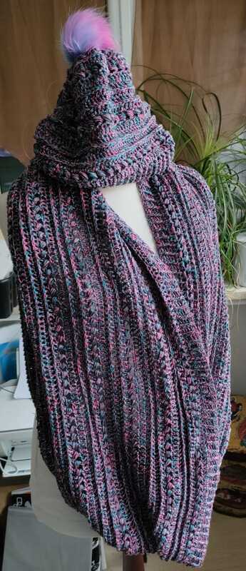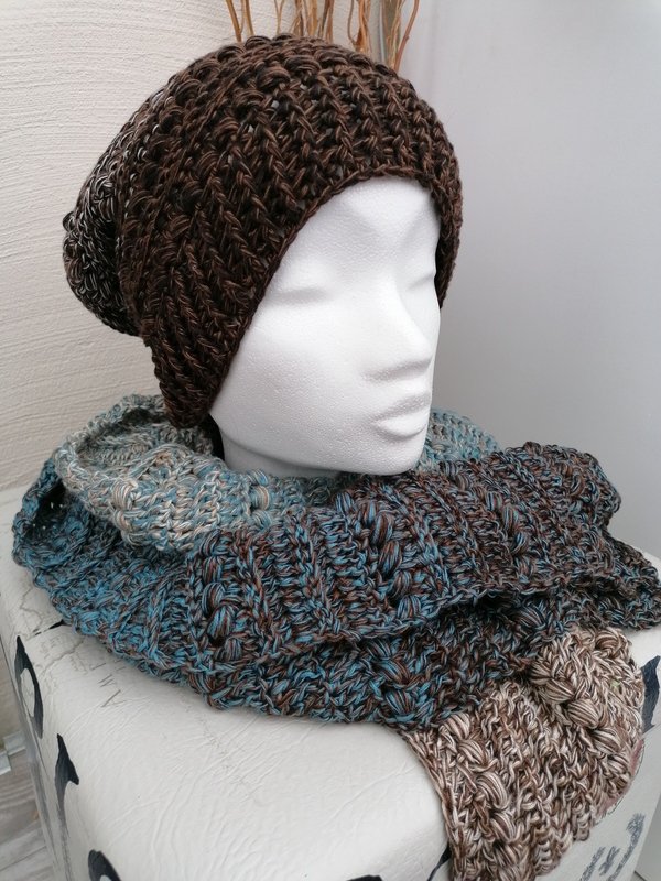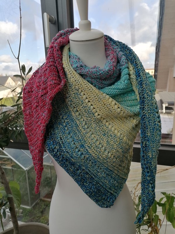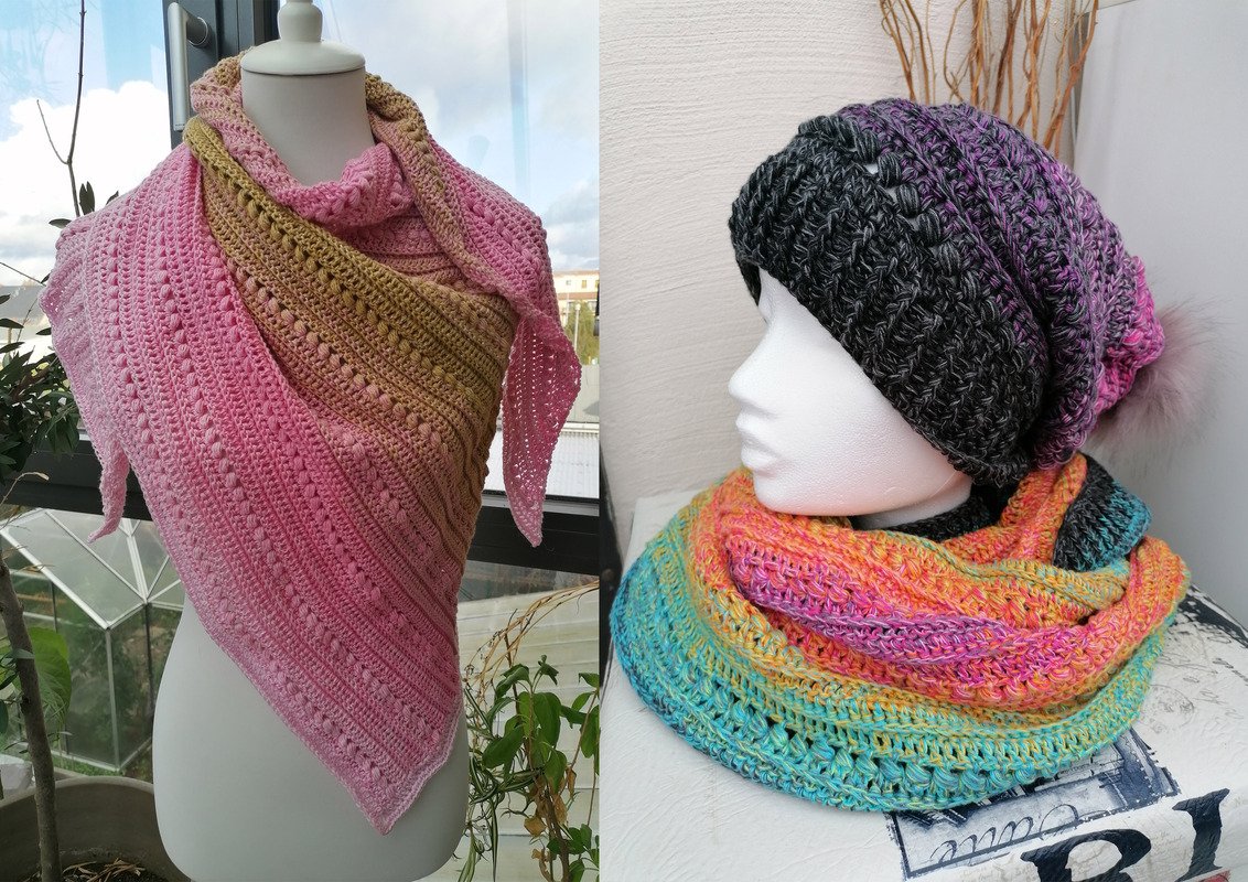 Dies ist eine Anleitung für ein asymetrisches Dreieckstuch, einen Loop, einen Schal und eine Mütze in zwei Varianten.