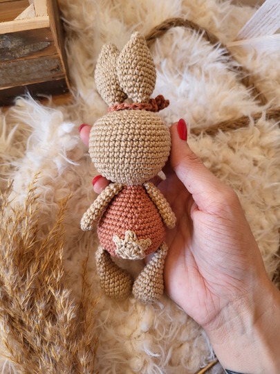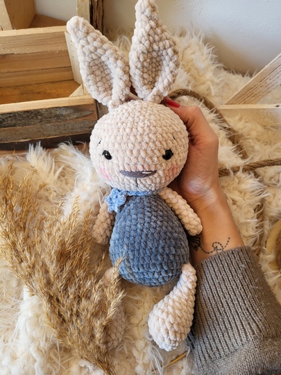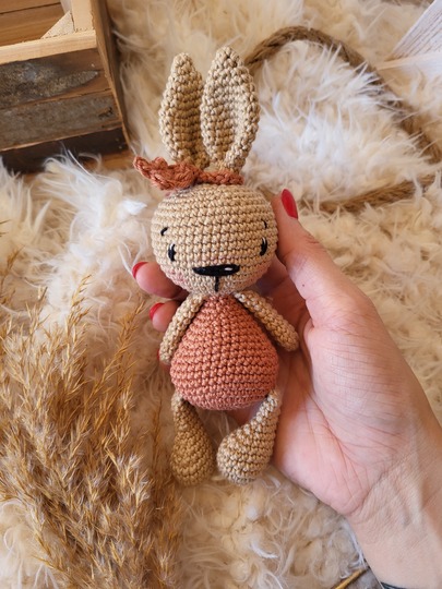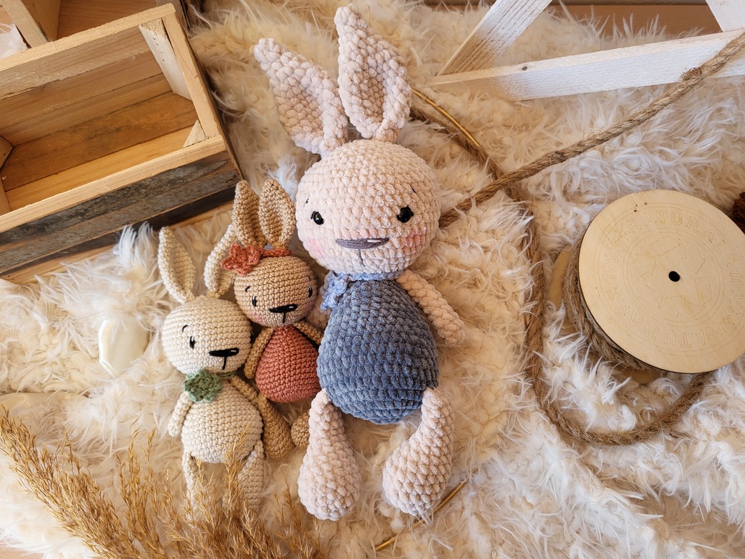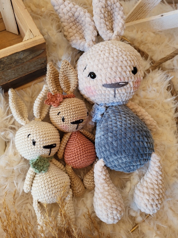 Der fertige Hase ist bei Verwendung von Wolle 50g/125m, ca. 19 cm groß.