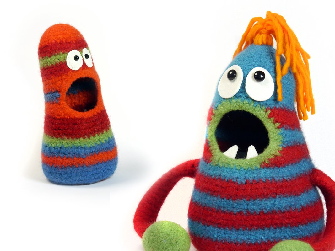 Lustige Monster in drei Größen – erst wird gehäkelt, dann in der Waschmaschine gefilzt.