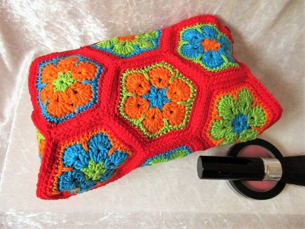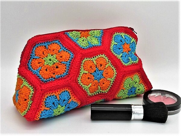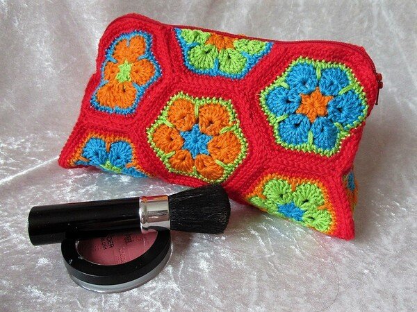 Zum 10. Geburtstag von Crazy Patterns habe ich diese fröhliche Kosmetiktasche aus African Flowers in den Farben des Logos von Crazy Patterns entworfen. Natürlich kannst du aber auch deine Lieblingsfarben oder ganz viele bunte Wollreste dafür verwenden.