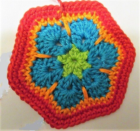 Die Anleitung ist 9 Seiten lang und enthält viele Bilder zur Erklärung der einzelnen Arbeitsschritte.Die Sechsecke werden einzeln gehäkelt und dann zusammengenäht oder aneinander gehäkelt. Dafür gibt es eine Schemazeichnung. Das Häkeln der African Flowers wird Runde für Runde beschrieben; es gibt aber auch eine Häkelschrift dafür.